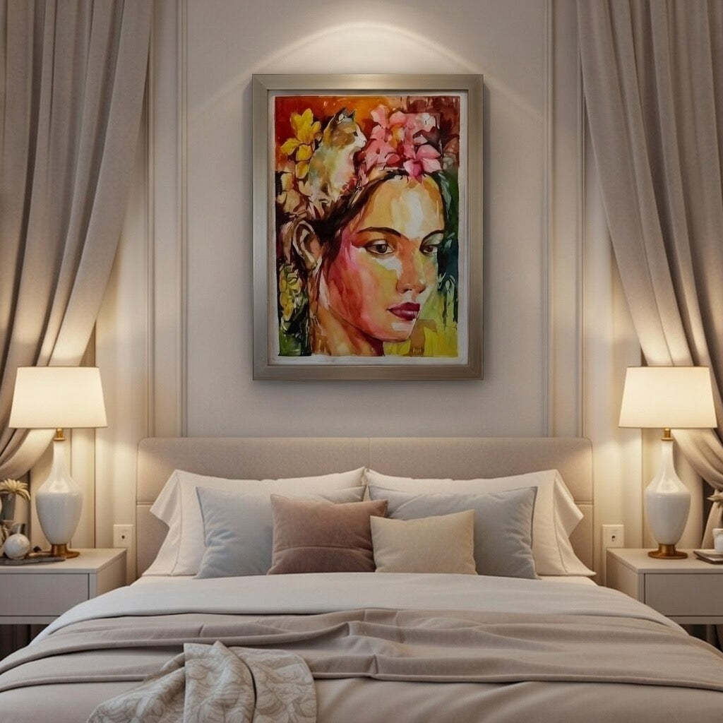 Regular price Rs. 4,500.00This hand-painted floral portrait watercolour painting beautifully captures feminine elegance through bold color expressions and soft watercolor transitions. The subject’s serene yet powerful gaze is enhanced by vibrant florals and warm tones, creating a harmonious balance between emotion and artistry.