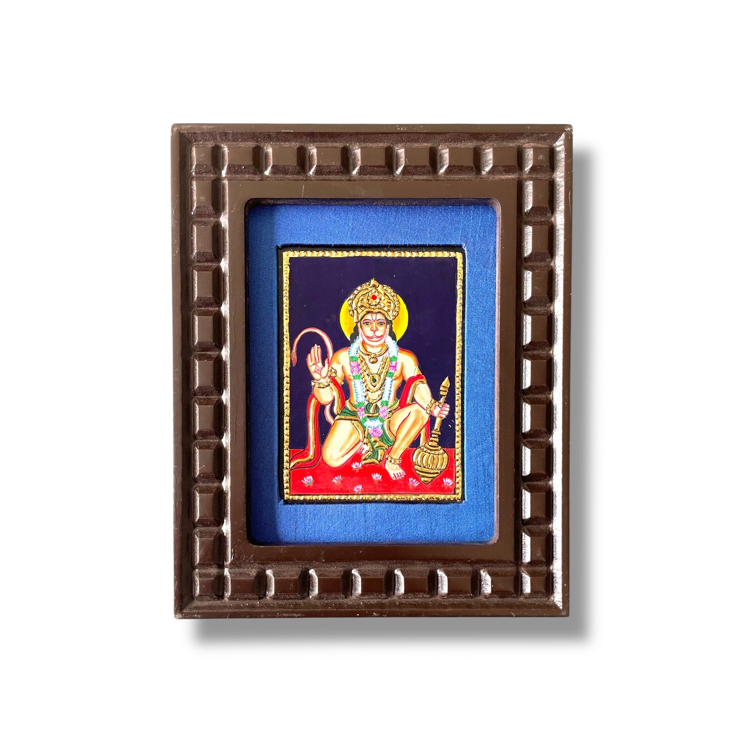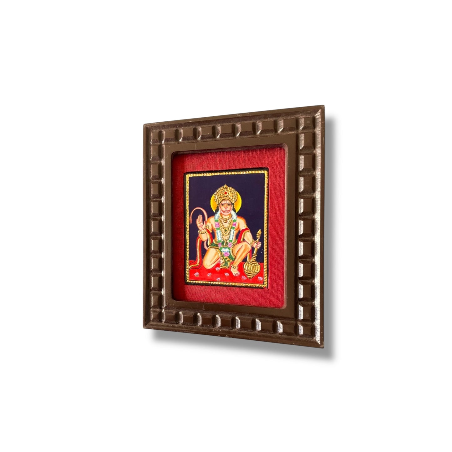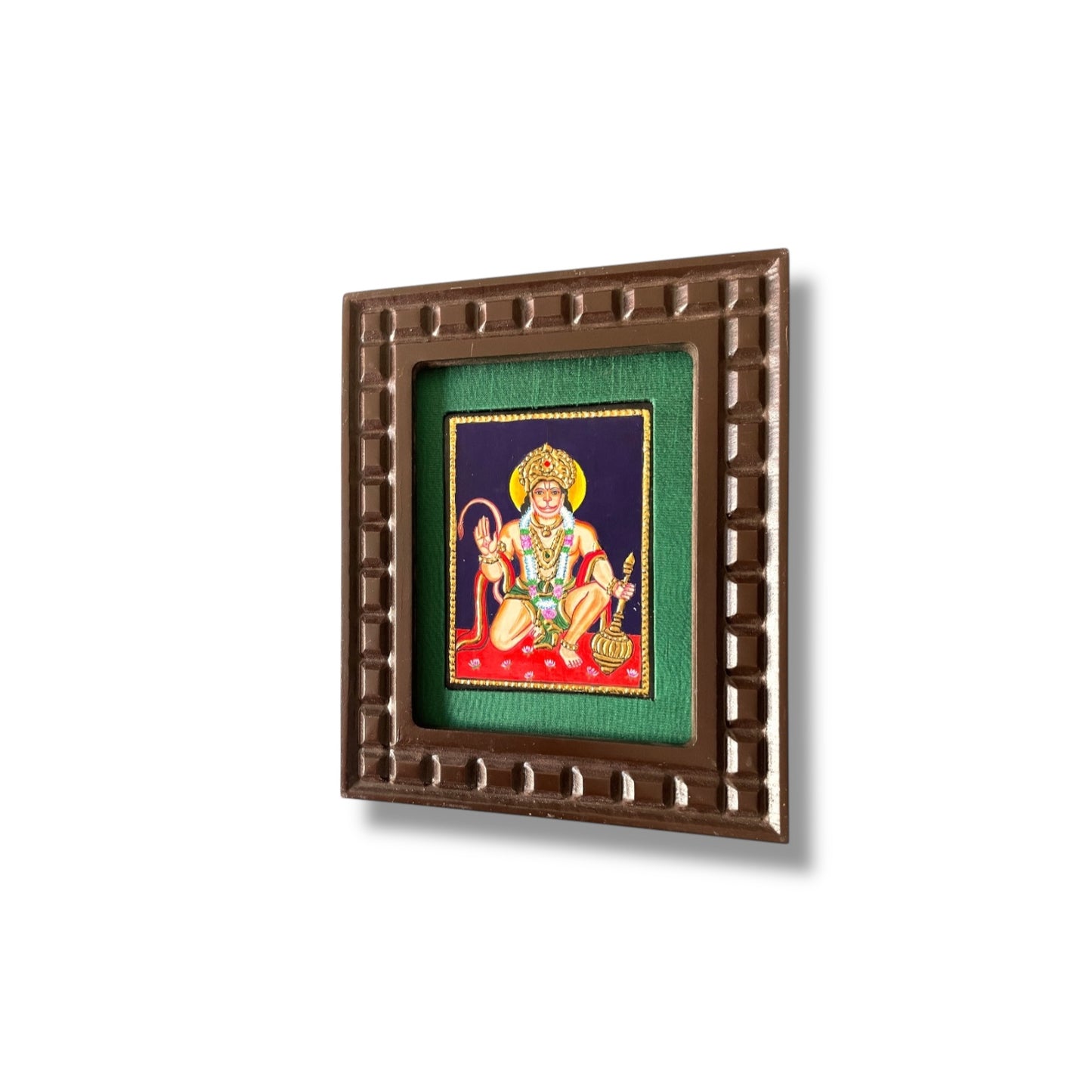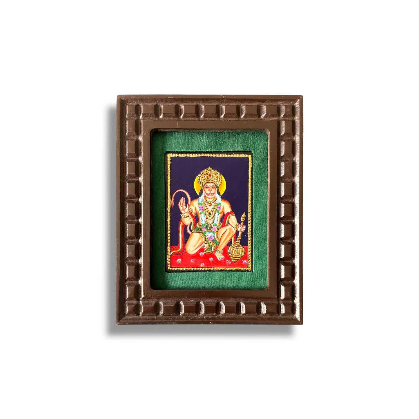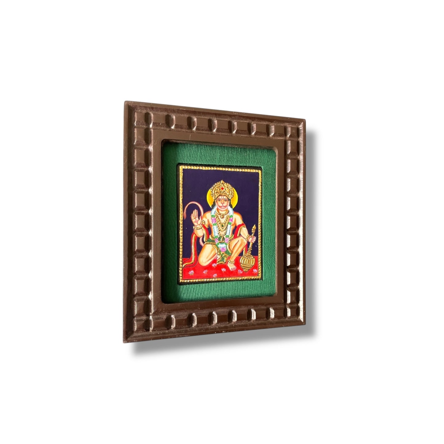 Hand-Painted Hanuman Tanjore Painting – Blessing Pose | Wooden Frame with Silk Mount (Green, Orange, Blue, Red)