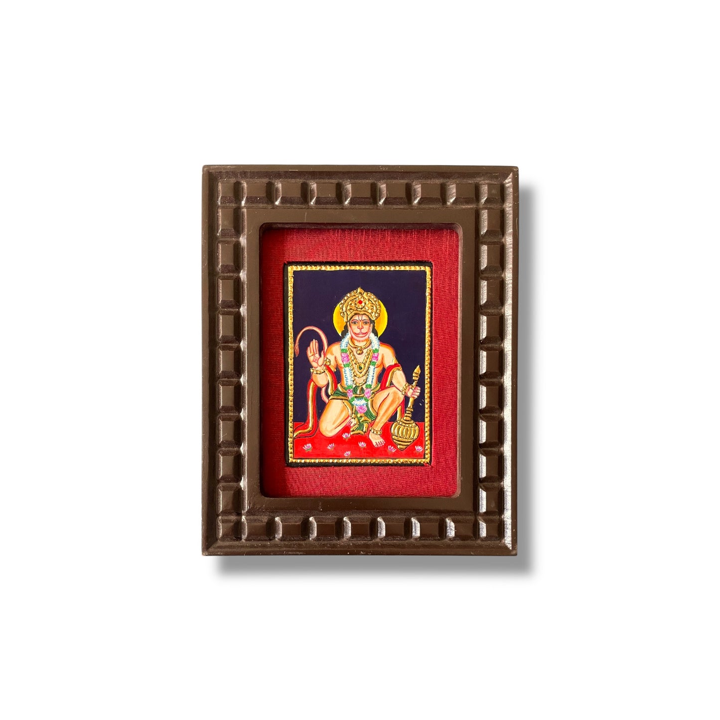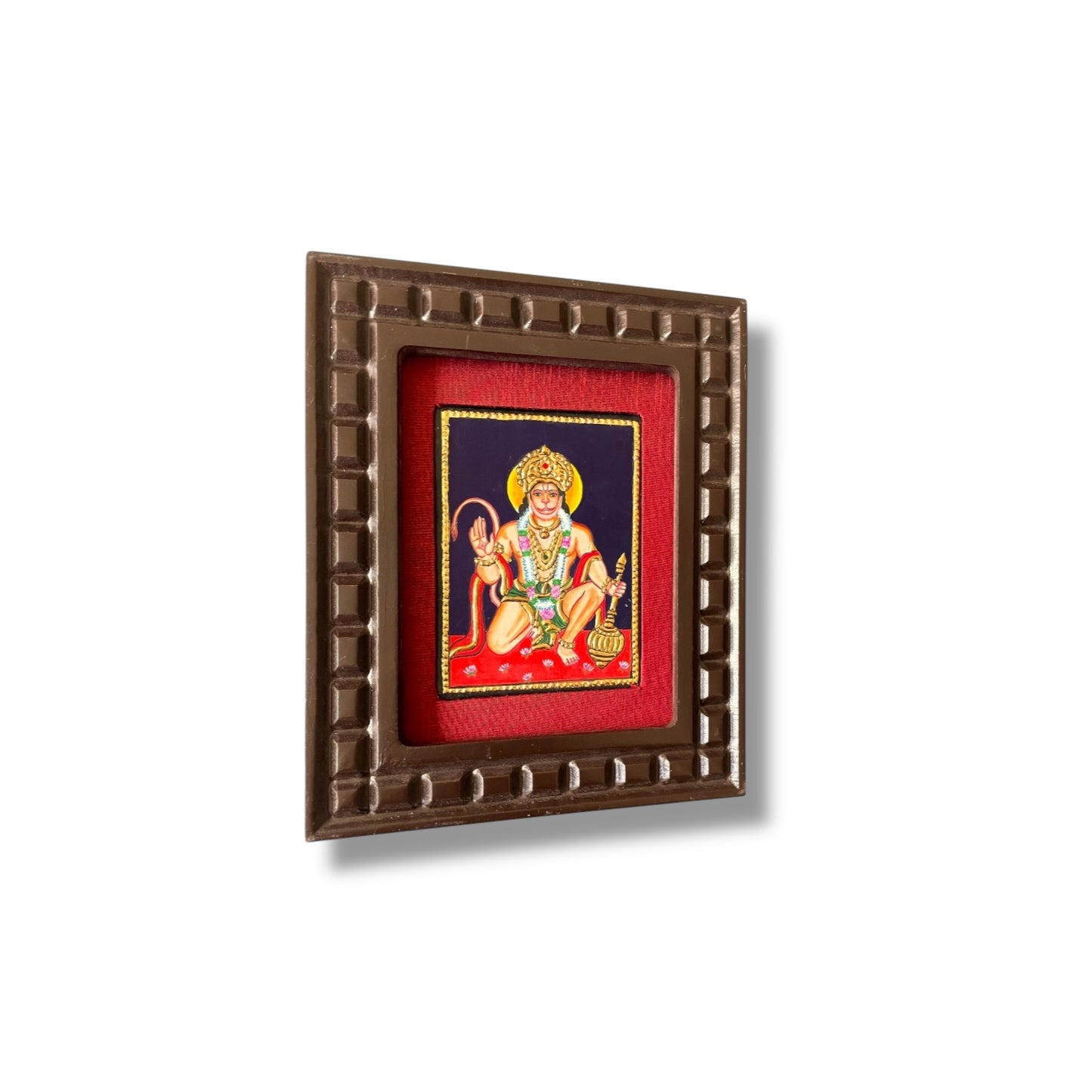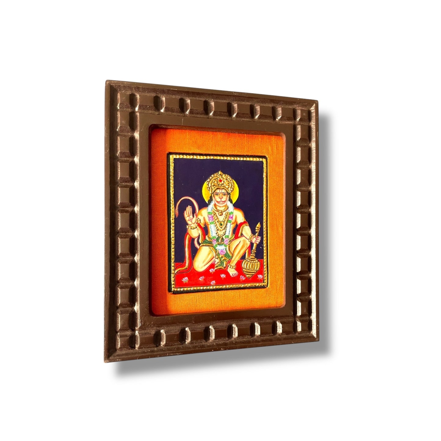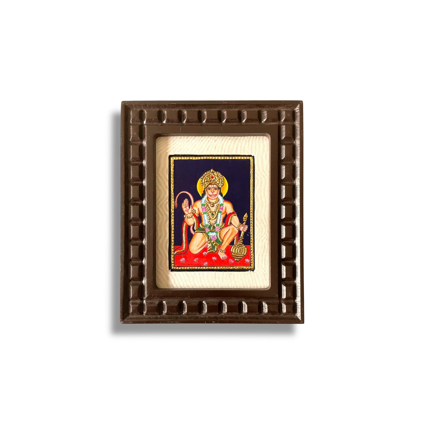 Hand-Painted Hanuman Tanjore Painting – Blessing Pose | Wooden Frame with Silk Mount (Green, Orange, Blue, Red)