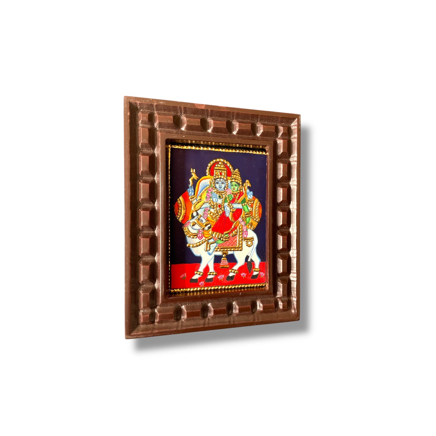 Regular price Rs. 4,300.00Shiva and Parvati seated on Nandi represent the union of divine strength, love, and balance. Nandi, the sacred bull and vehicle of Lord Shiva, symbolizes loyalty, purity, and devotion. Together, Shiva and Parvati riding Nandi convey the harmony of consciousness and energy, showing the balance of masculine and feminine powers.