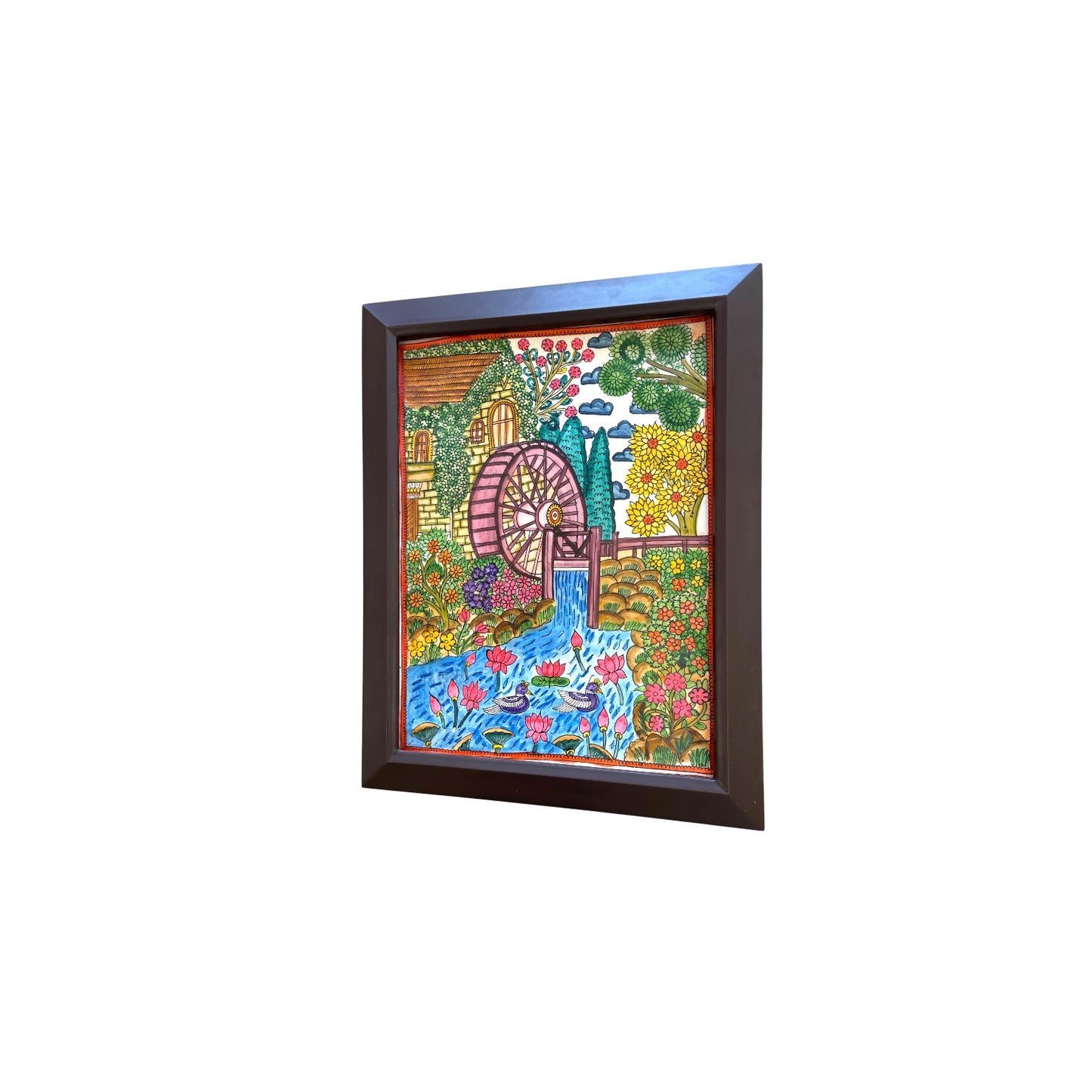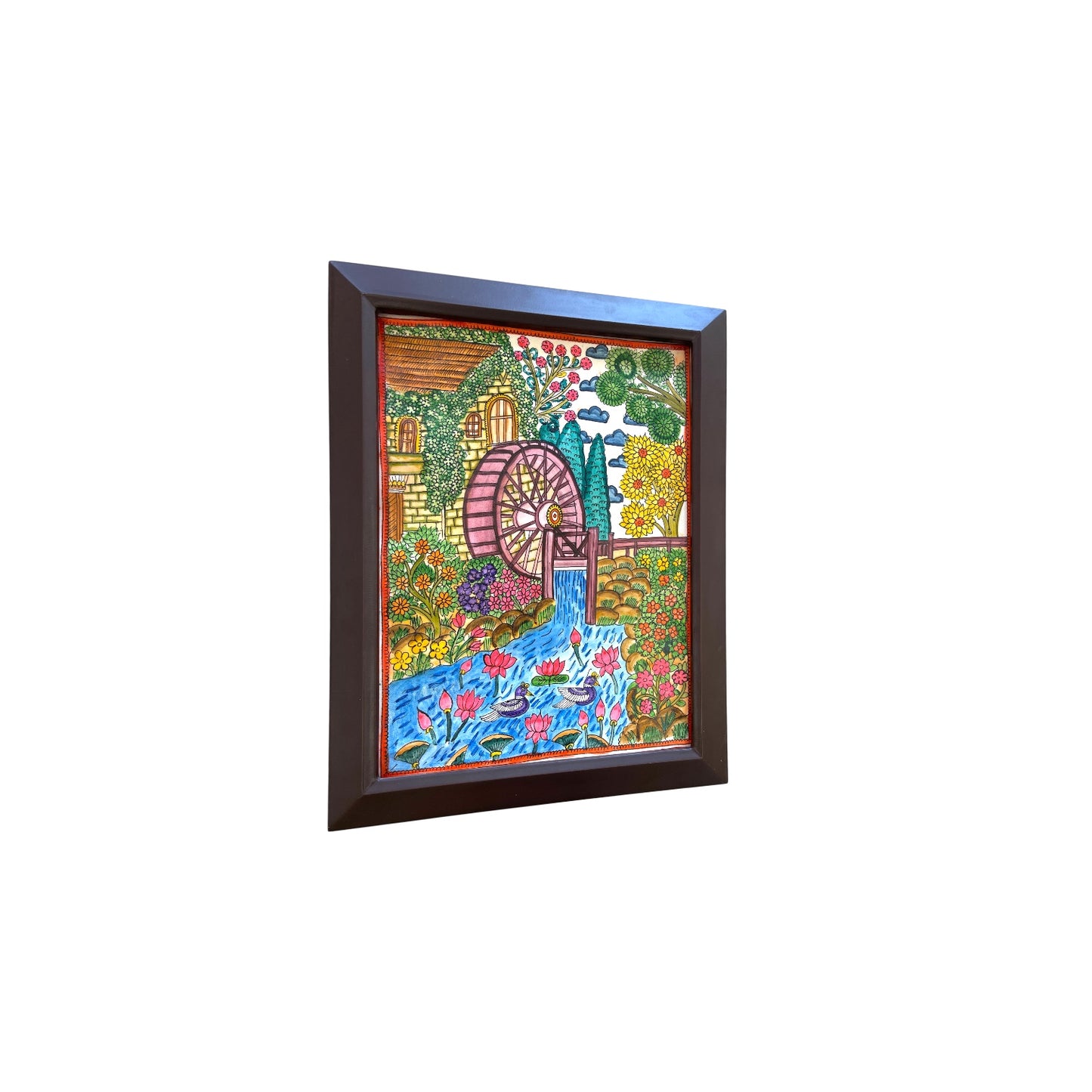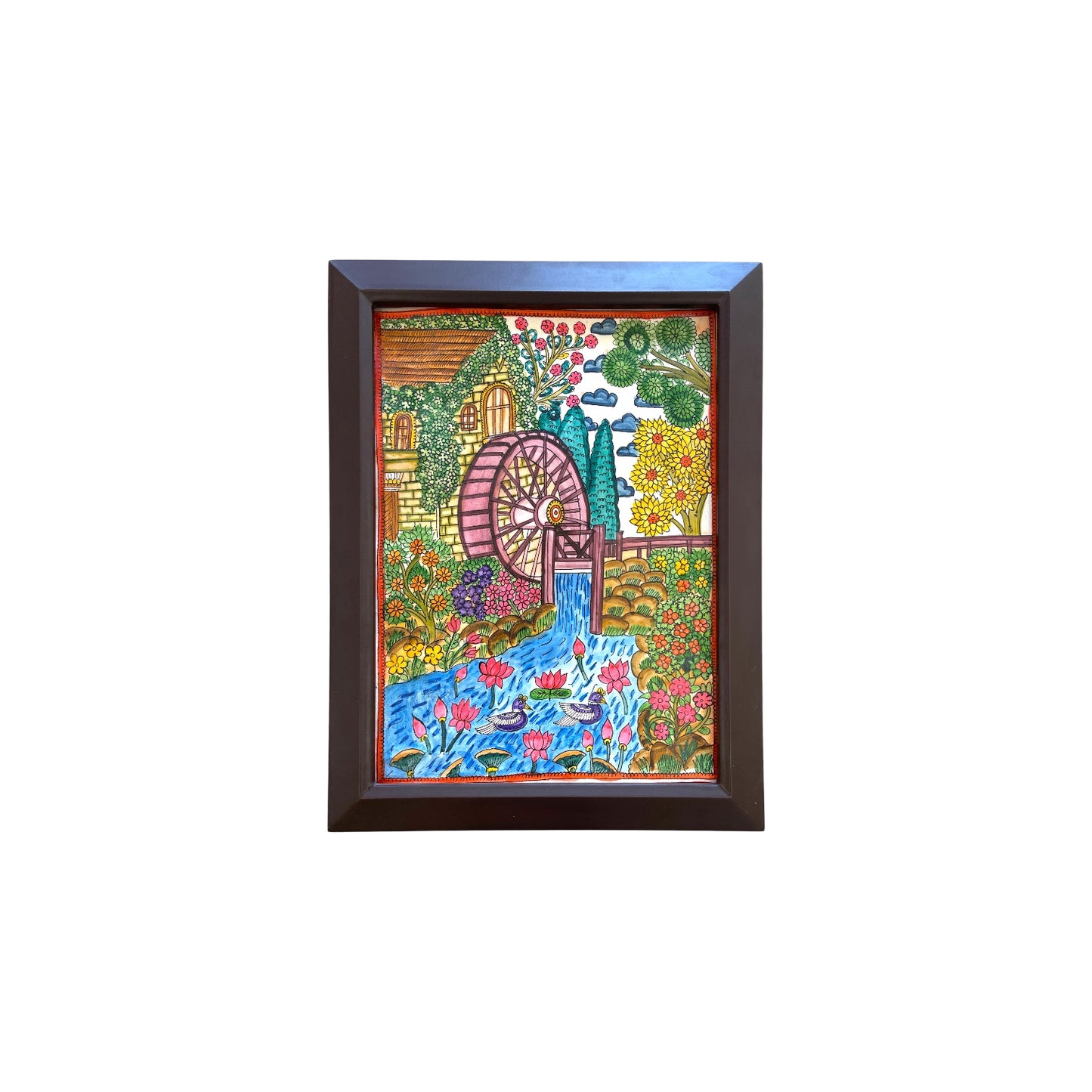 Handmade Kalamkari Painting of Watermill and Lotus Pond | Traditional Indian Folk Art Wall Décor