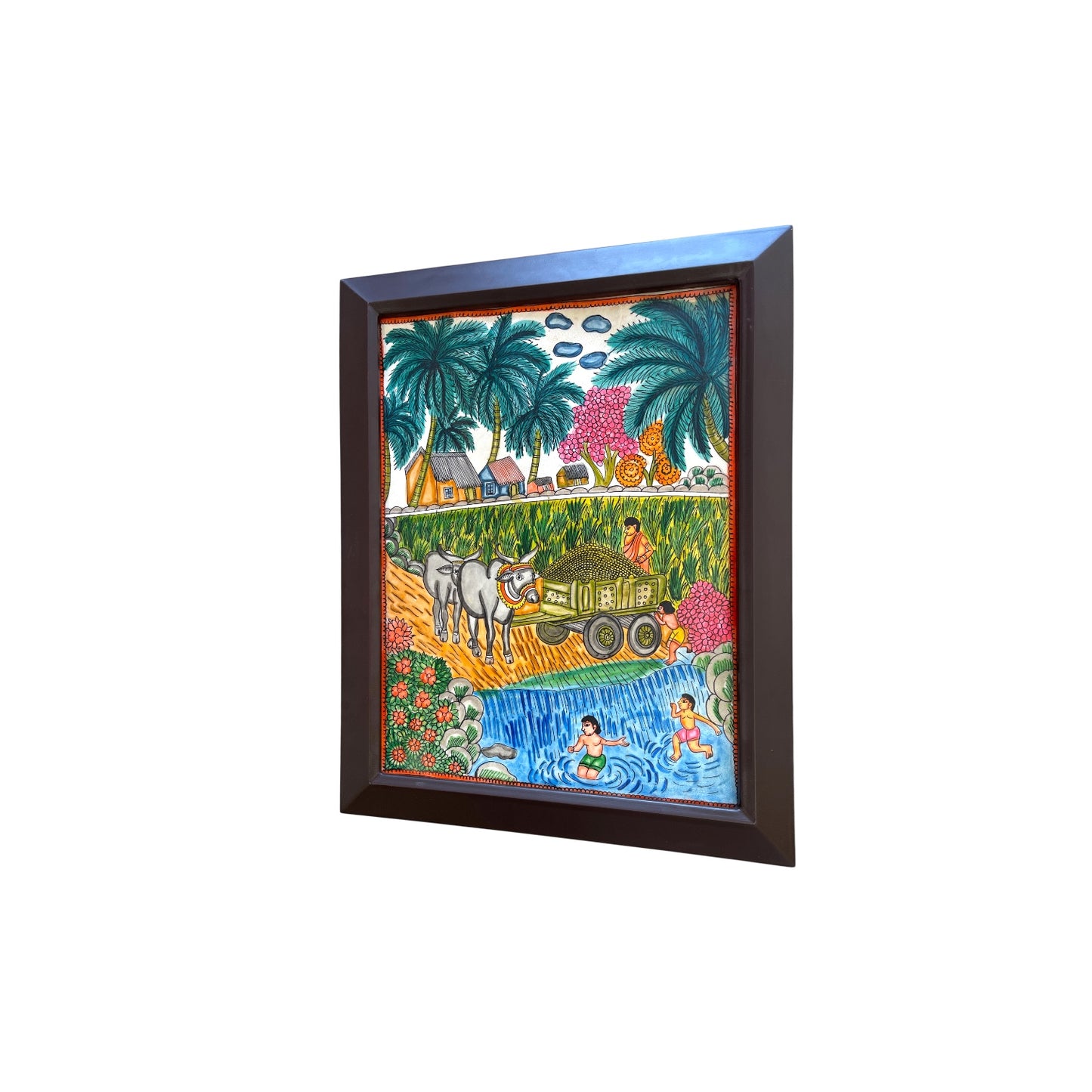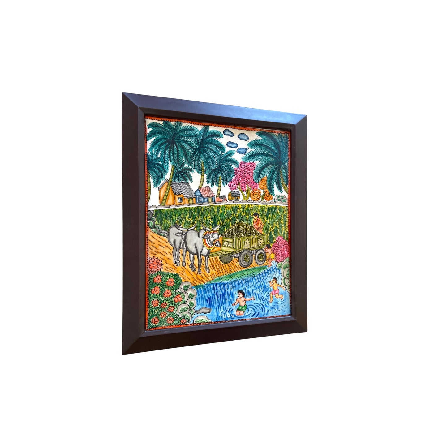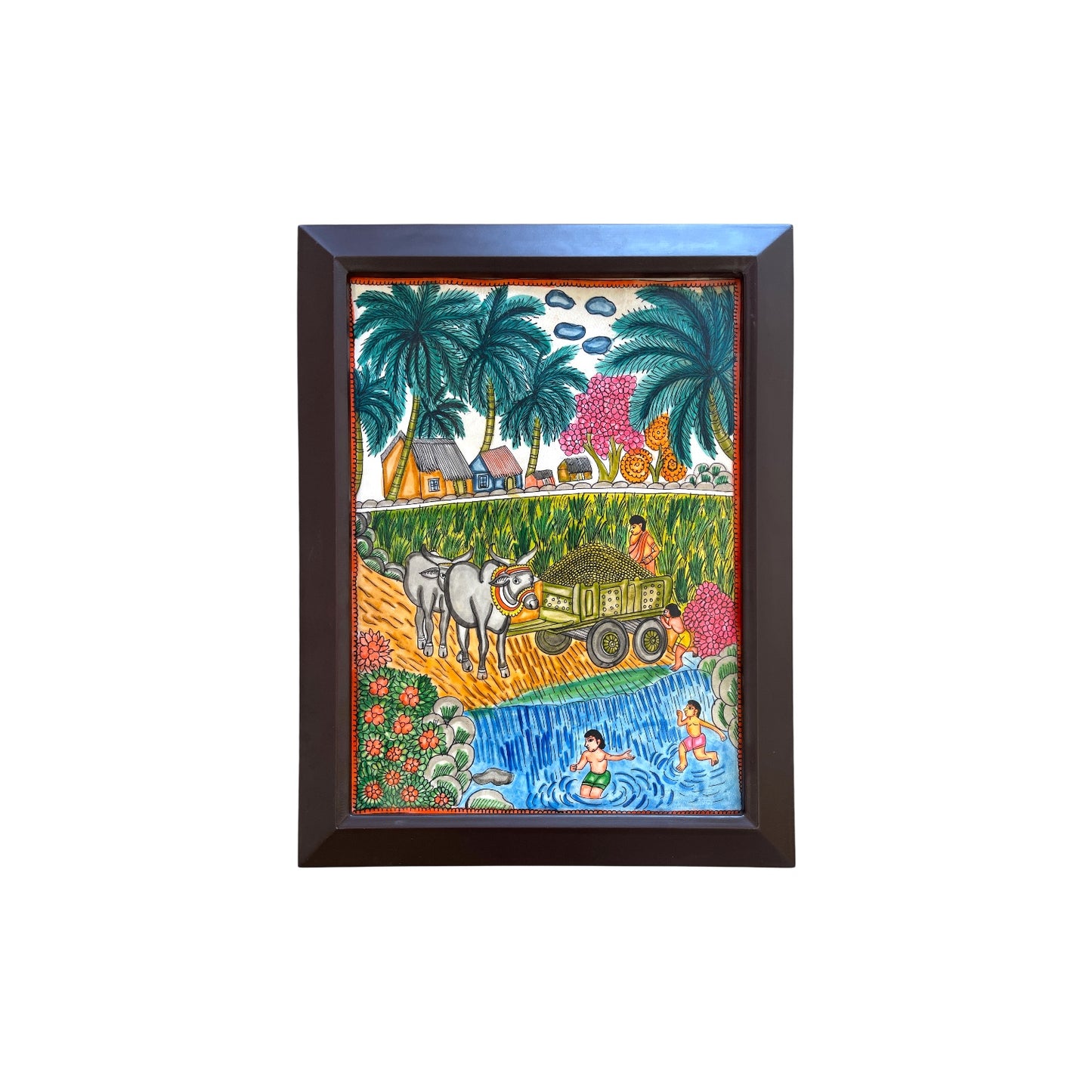 Handmade Kalamkari Painting of Village Life with Bullock Cart and Palm Trees