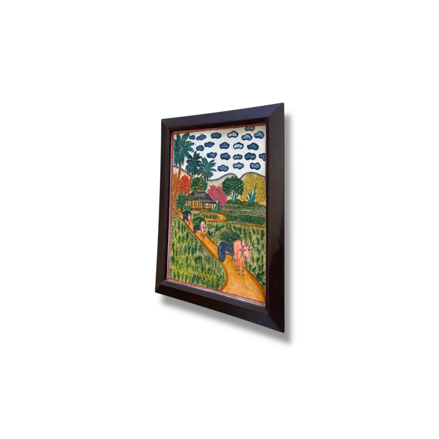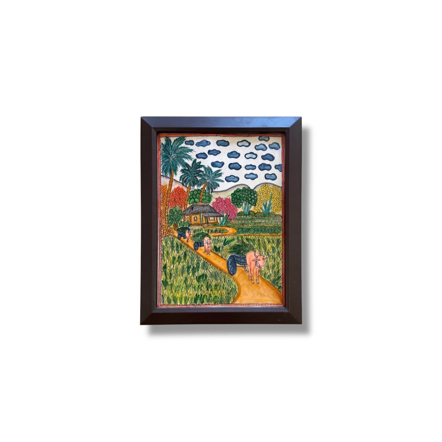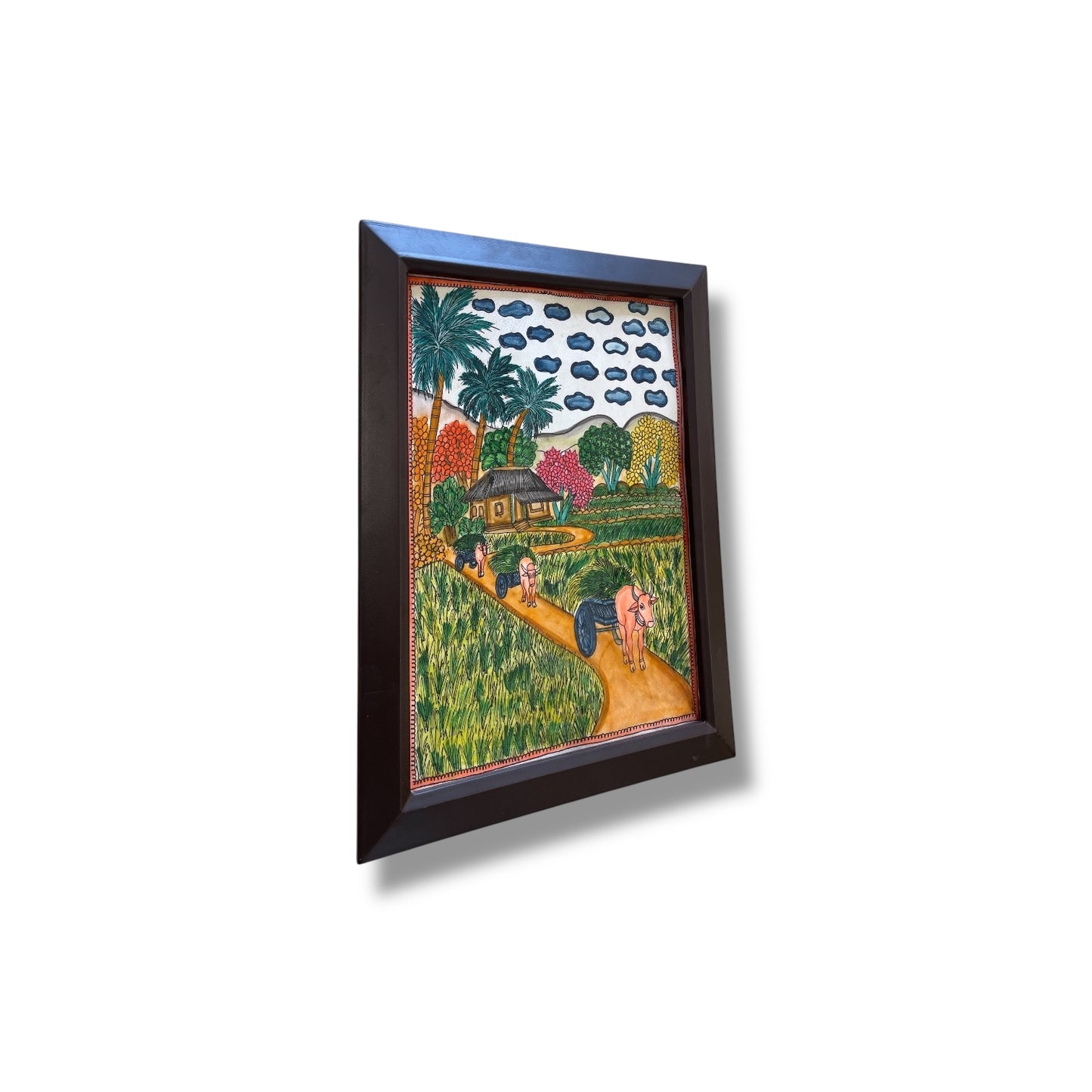 Regular price Rs. 3,900.00Celebrate the simplicity and beauty of rural India with this handcrafted Kalamkari painting depicting a serene village scene. Featuring bullock carts, lush green fields, coconut trees, and a thatched house under a sky full of clouds, this artwork captures the essence of traditional Indian countryside life. Made with vibrant natural colors and intricate detailing, this folk-style painting is perfect for ethnic home decor, gifting, or adding a rustic charm to your space. Framed and ready to display.