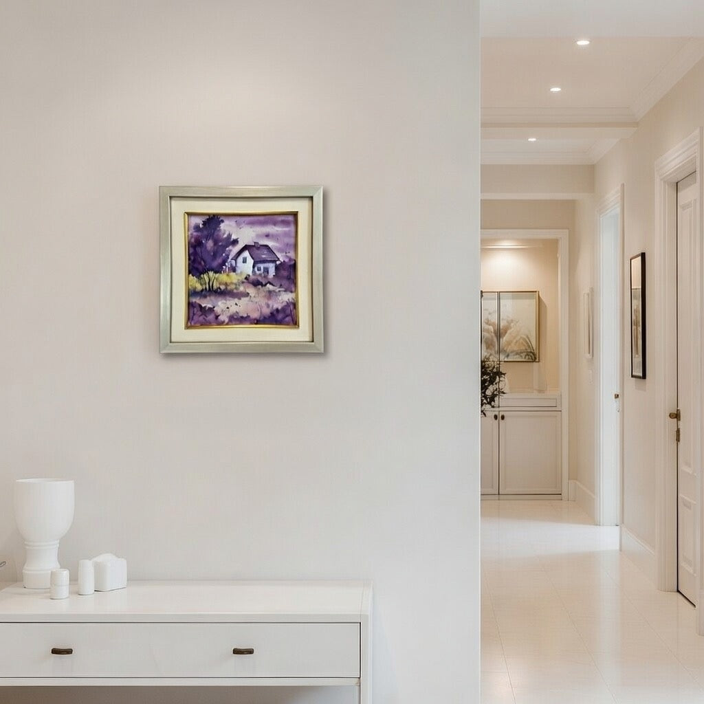 Dreamy Countryside Cottage Watercolour Painting | Framed Purple Landscape Wall Art