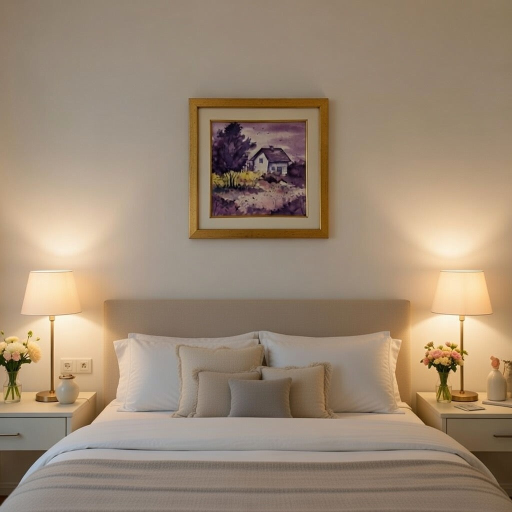 Regular price Rs. 1,200.00Add a touch of calm elegance to your interiors with this hand-painted countryside cottage watercolour artwork. Set against a soft purple and lavender-toned landscape, the painting features a peaceful cottage surrounded by trees, gentle foliage, and birds in flight—creating a dreamlike, poetic atmosphere.