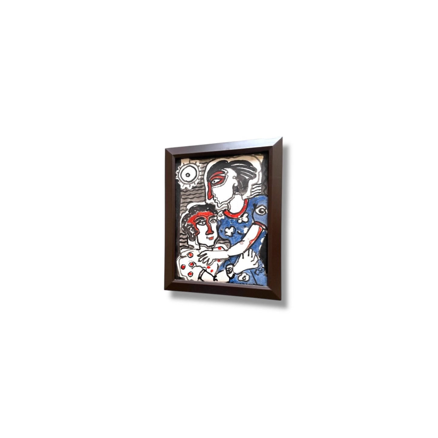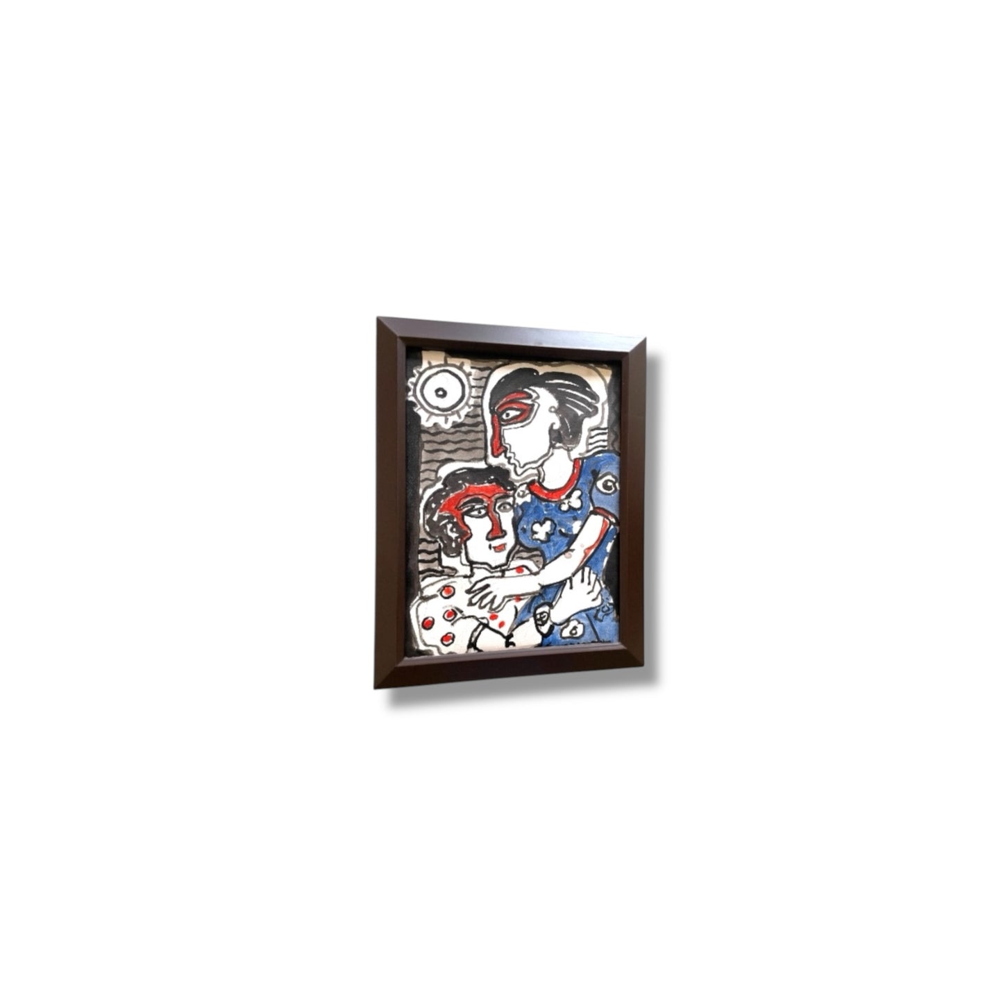 Discover a striking pop art painting featuring two stylized figures in an emotional embrace, rendered in bold red, blue, and black tones. This framed artwork embodies modern expressionism and abstract storytelling, making it a perfect addition to contemporary home decor or art collections. Ideal for lovers of bold lines, vivid contrasts, and unique visual narratives in pop art. Great for living rooms, galleries, or creative spaces.
