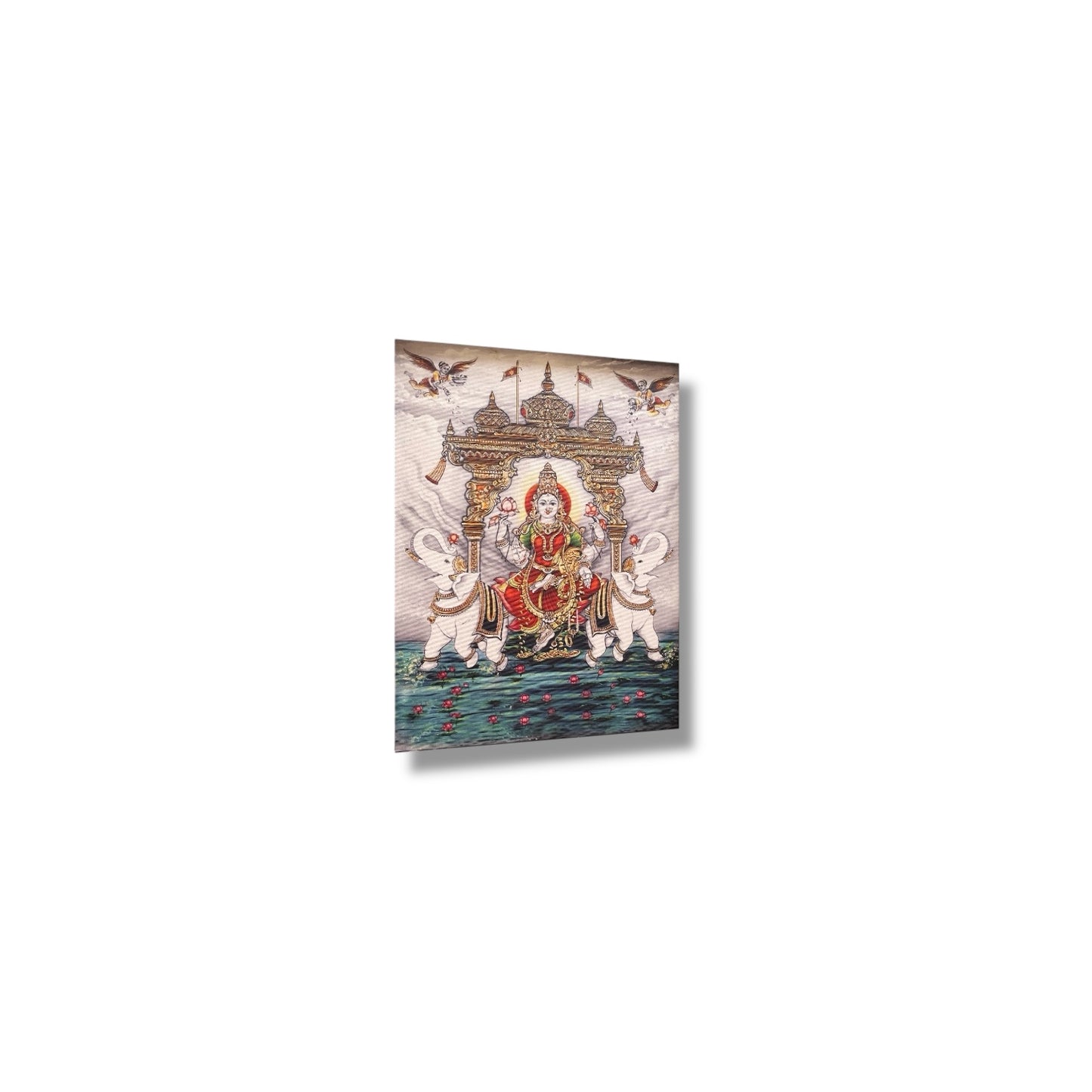 This exquisite Goddess Lakshmi painting portrays Devi Lakshmi seated gracefully on a lotus throne, accompanied by divine elephants symbolizing prosperity, abundance, and blessings. The intricate details, rich colors, and spiritual aura make this artwork a perfect addition to temples, pooja rooms, meditation spaces, and home décor. A timeless symbol of wealth and fortune, this painting radiates positive energy and grace.