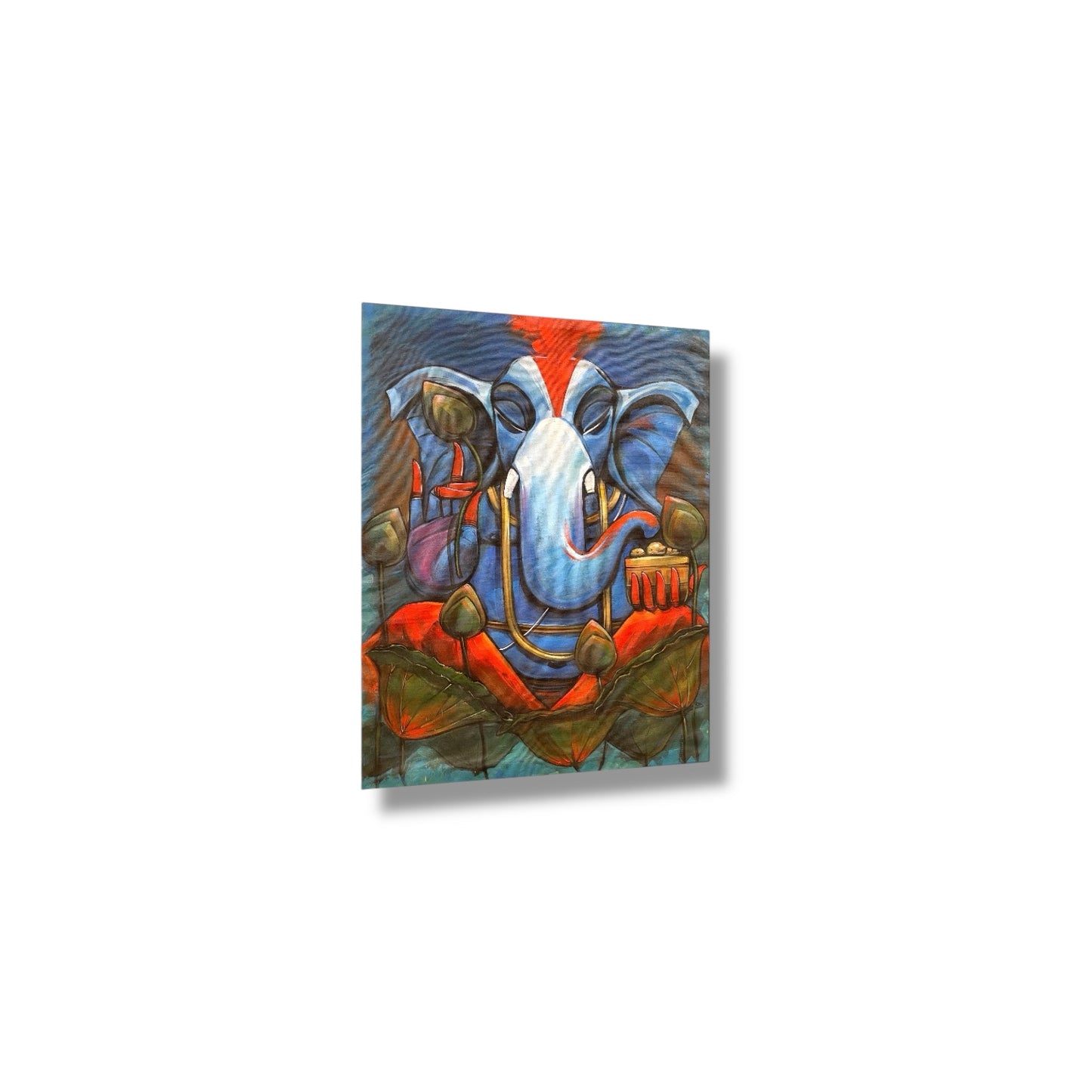 This spiritual Ganesha painting showcases Lord Ganesh in a stunning blue form, surrounded by lotus buds and rich earthy tones. The artwork radiates divine blessings, prosperity, and positivity, making it a perfect centerpiece for homes, temples, meditation spaces, or offices. Handcrafted with vibrant colors and detailed brushwork, this painting reflects both spirituality and modern artistry.