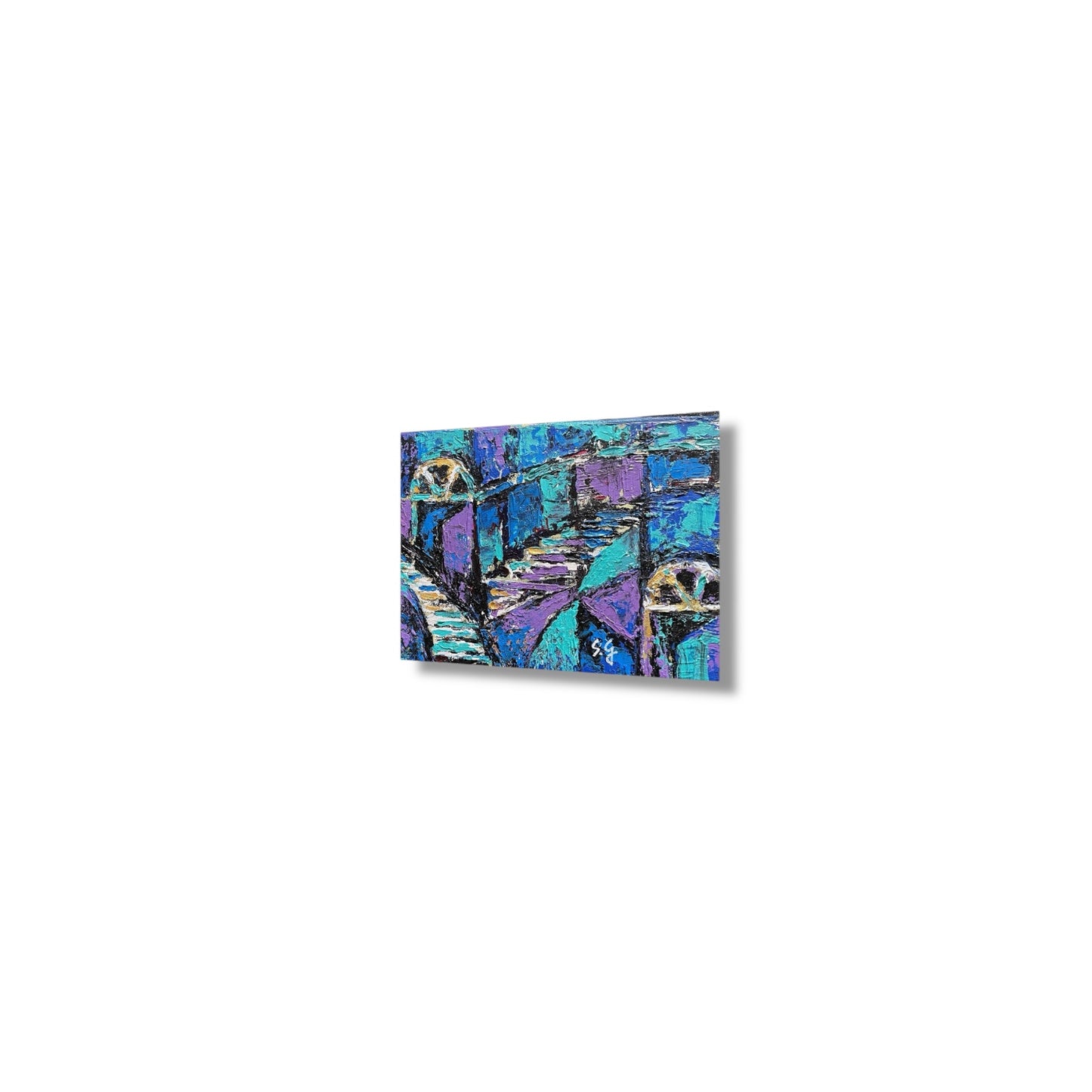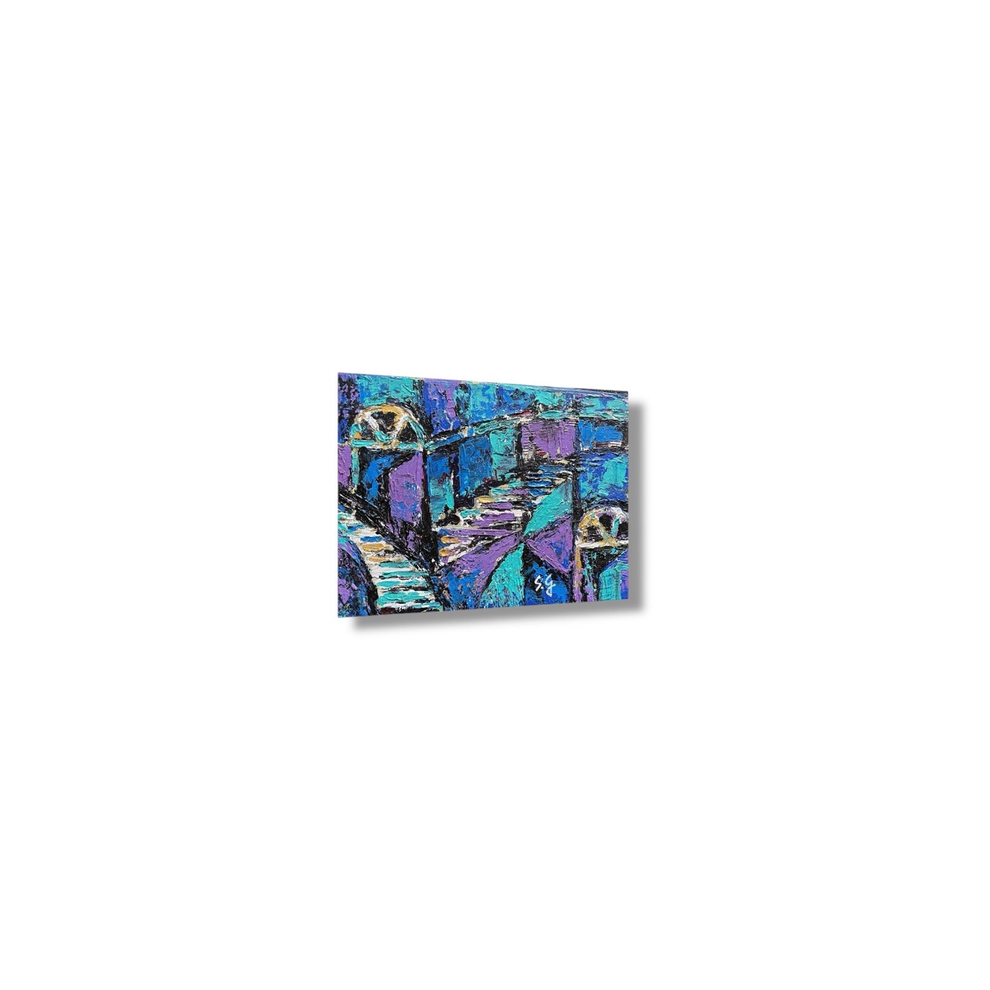 This abstract geometric painting features bold strokes of blue, purple, and teal with textured detailing that creates depth and movement. The composition of sharp lines and layered colors brings a modern edge to your walls, making it ideal for contemporary home and office décor. A striking piece for art collectors and interior design enthusiasts alike.