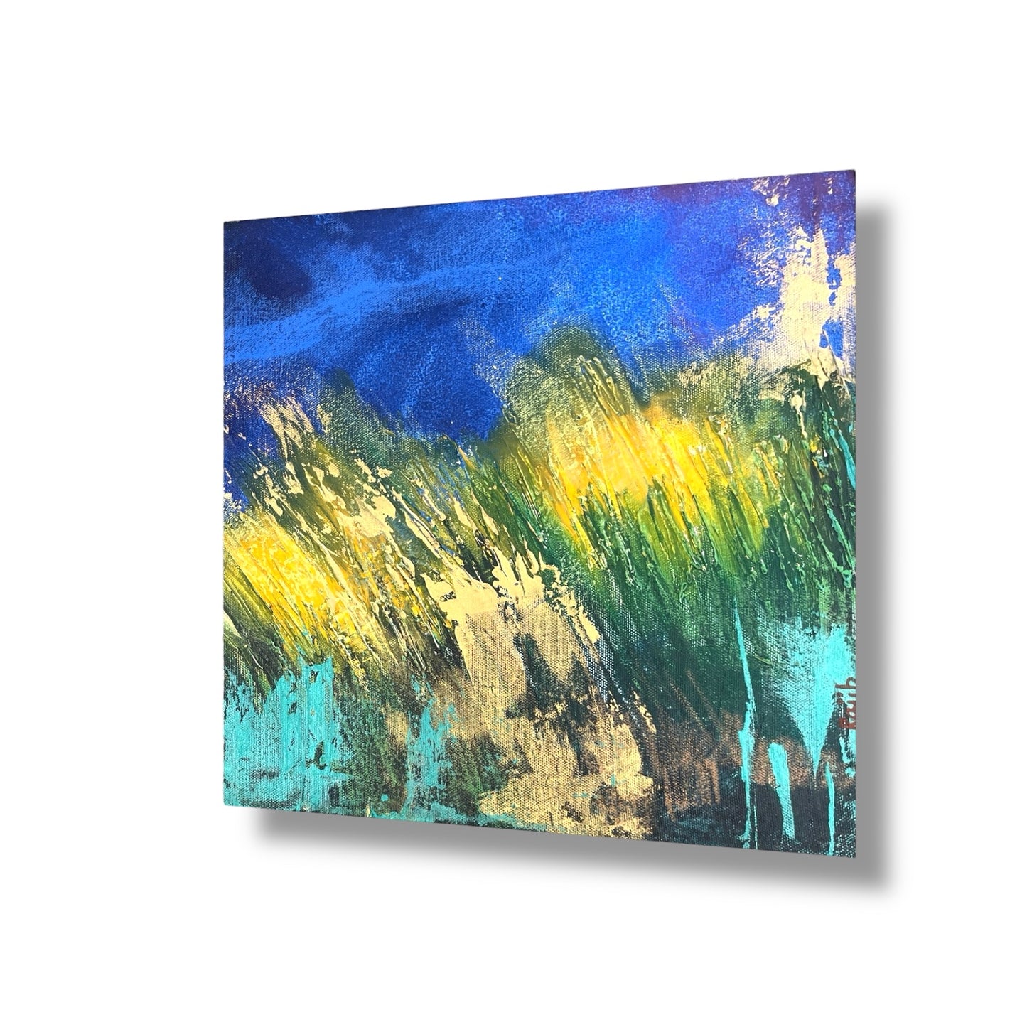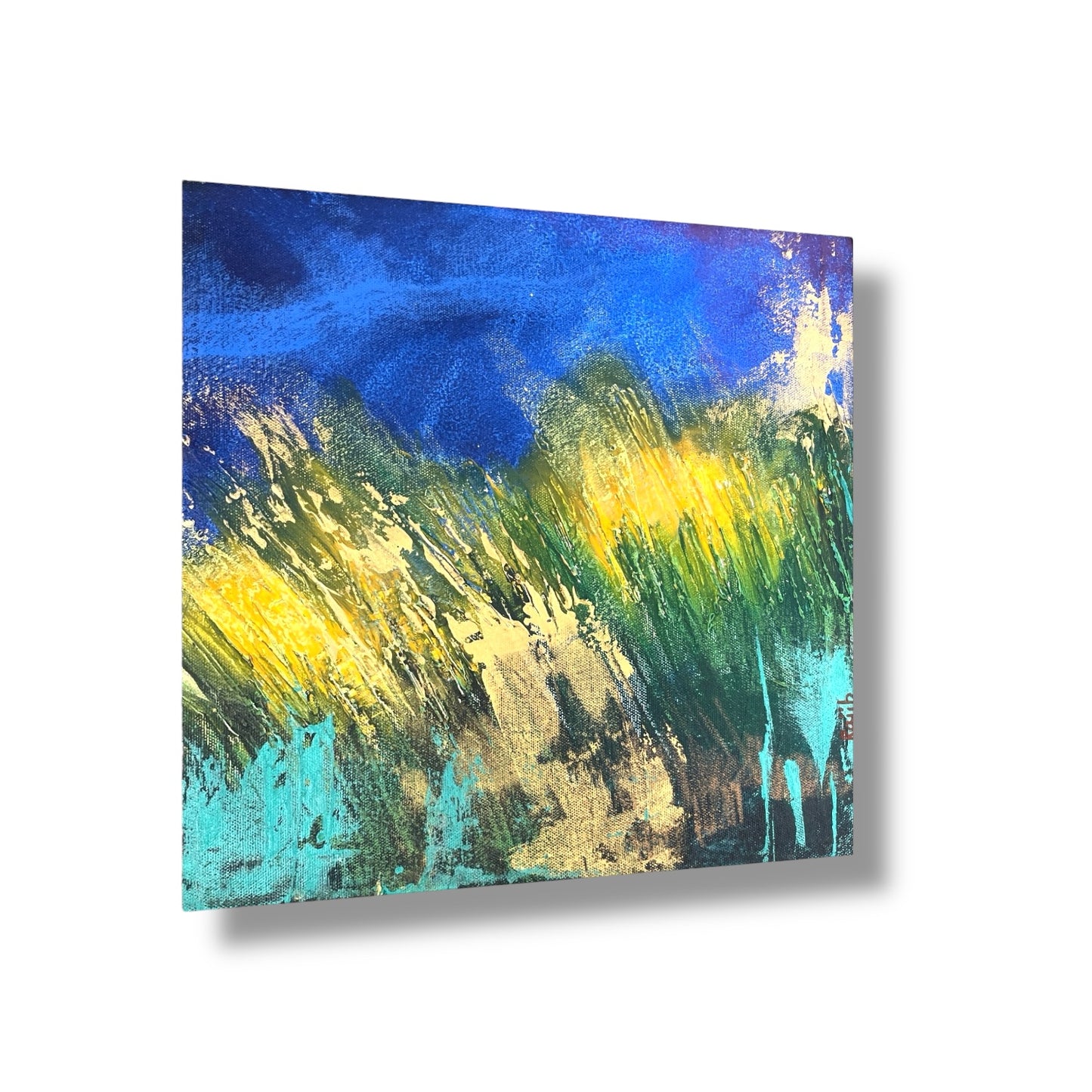 This vibrant abstract painting beautifully blends deep blue skies with golden-yellow fields and textured green strokes, evoking the raw beauty of nature. The bold colors and expressive brushwork make it a perfect statement piece for modern interiors, art collectors, or abstract art enthusiasts. Ideal for living rooms, offices, or galleries, this artwork adds depth, energy, and sophistication to any space.