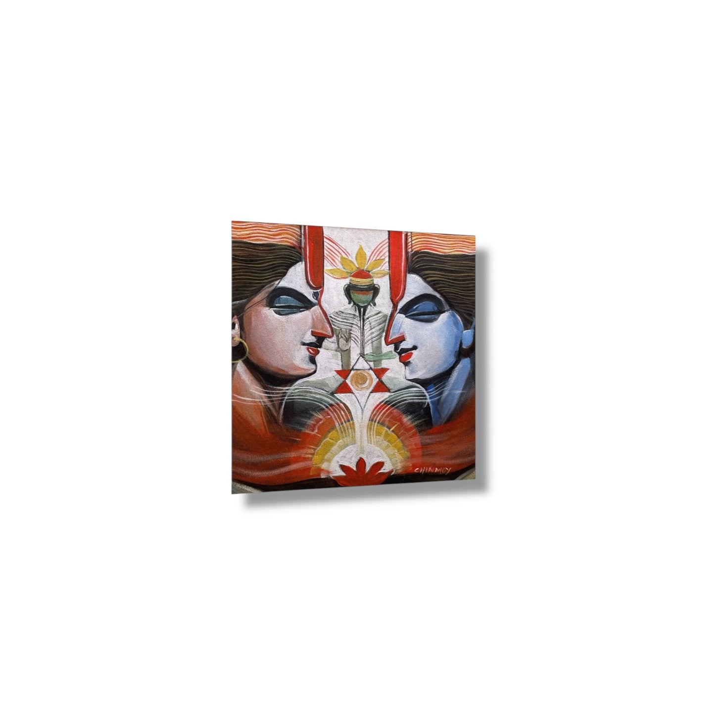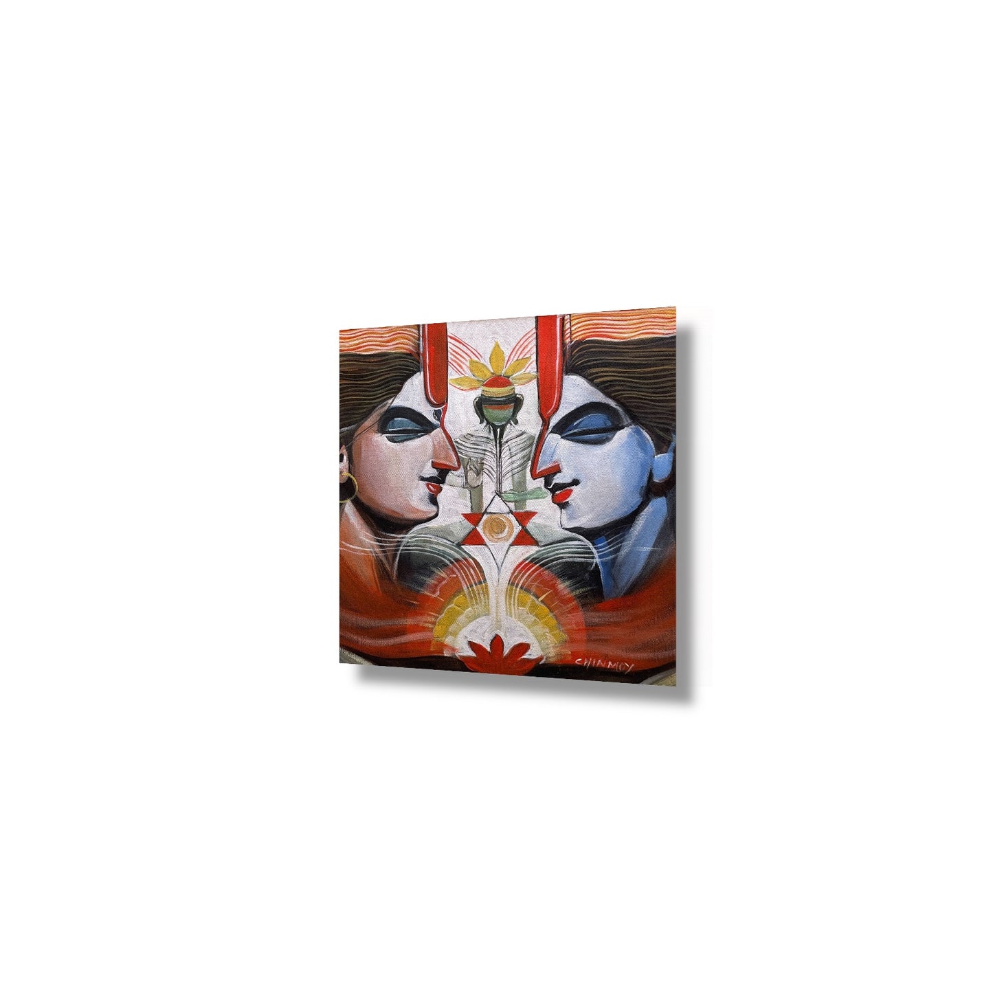 This Indian contemporary painting beautifully symbolizes divine union and spiritual harmony through two mirrored faces rendered in vibrant red and blue hues. The artwork blends traditional symbolism with a modern aesthetic, featuring lotus motifs and sacred geometry that evoke balance, love, and enlightenment. Perfect for art collectors and interior spaces, this canvas captures the soulful essence of Indian modern art with timeless elegance.