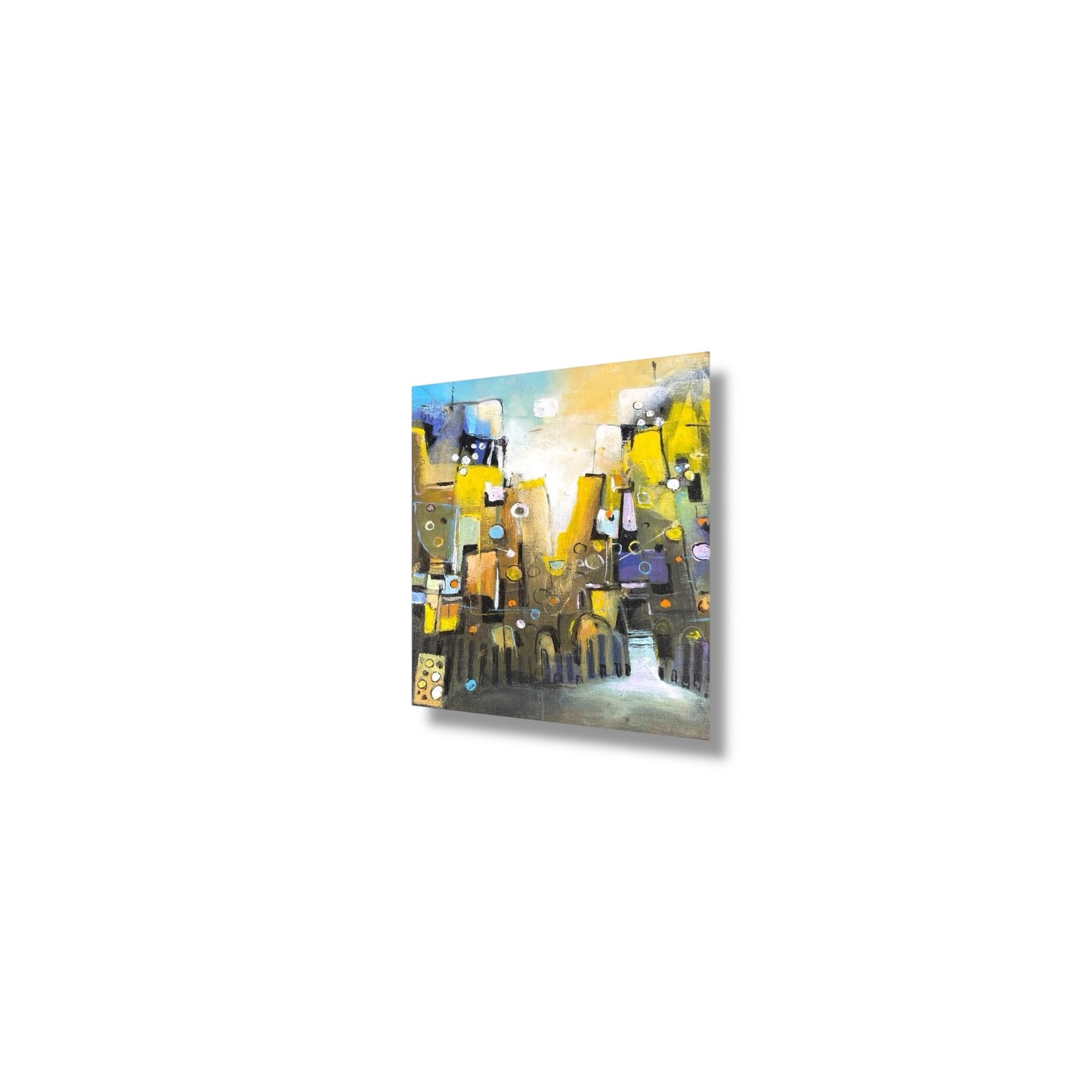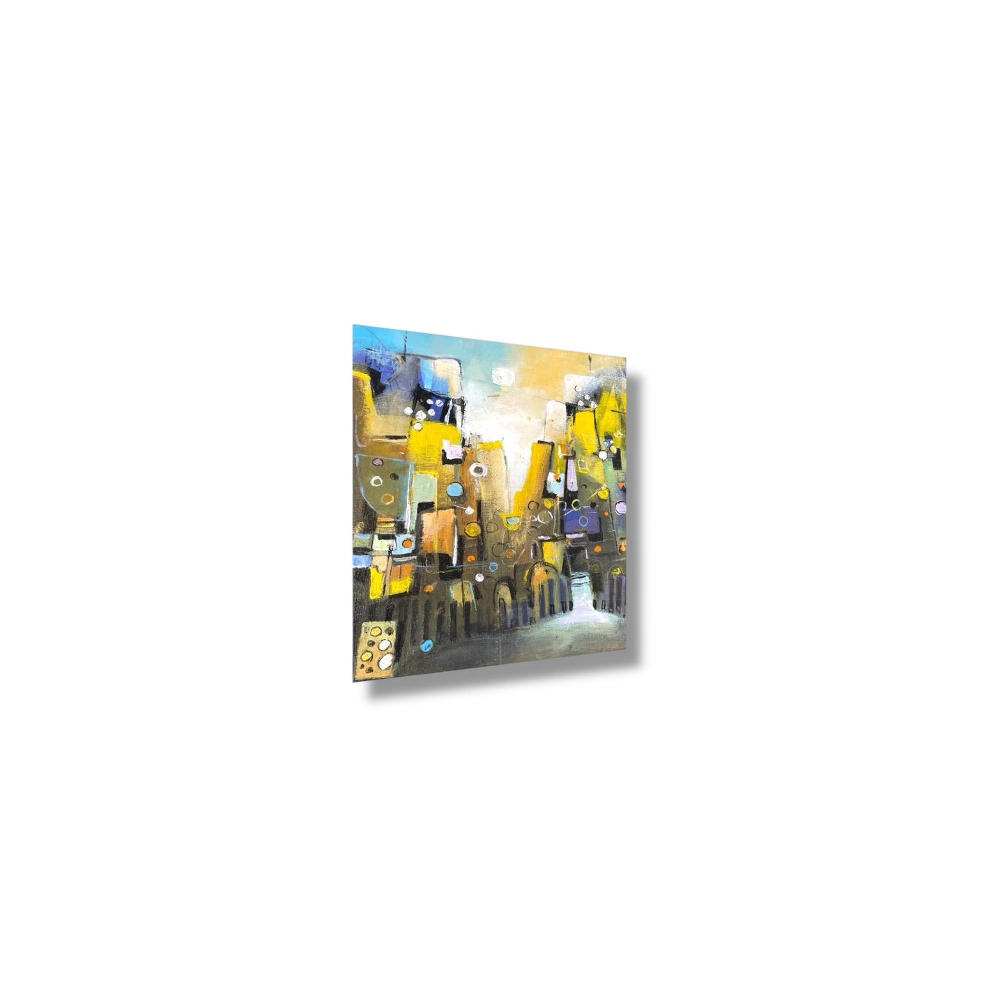 This captivating abstract painting features a golden cityscape with bold strokes of yellow, blue, and black, enhanced by geometric patterns and circular accents. The textured layers create depth and movement, giving the impression of an illuminated urban skyline. Perfect for adding a modern, artistic vibe to living rooms, offices, or contemporary art collections.