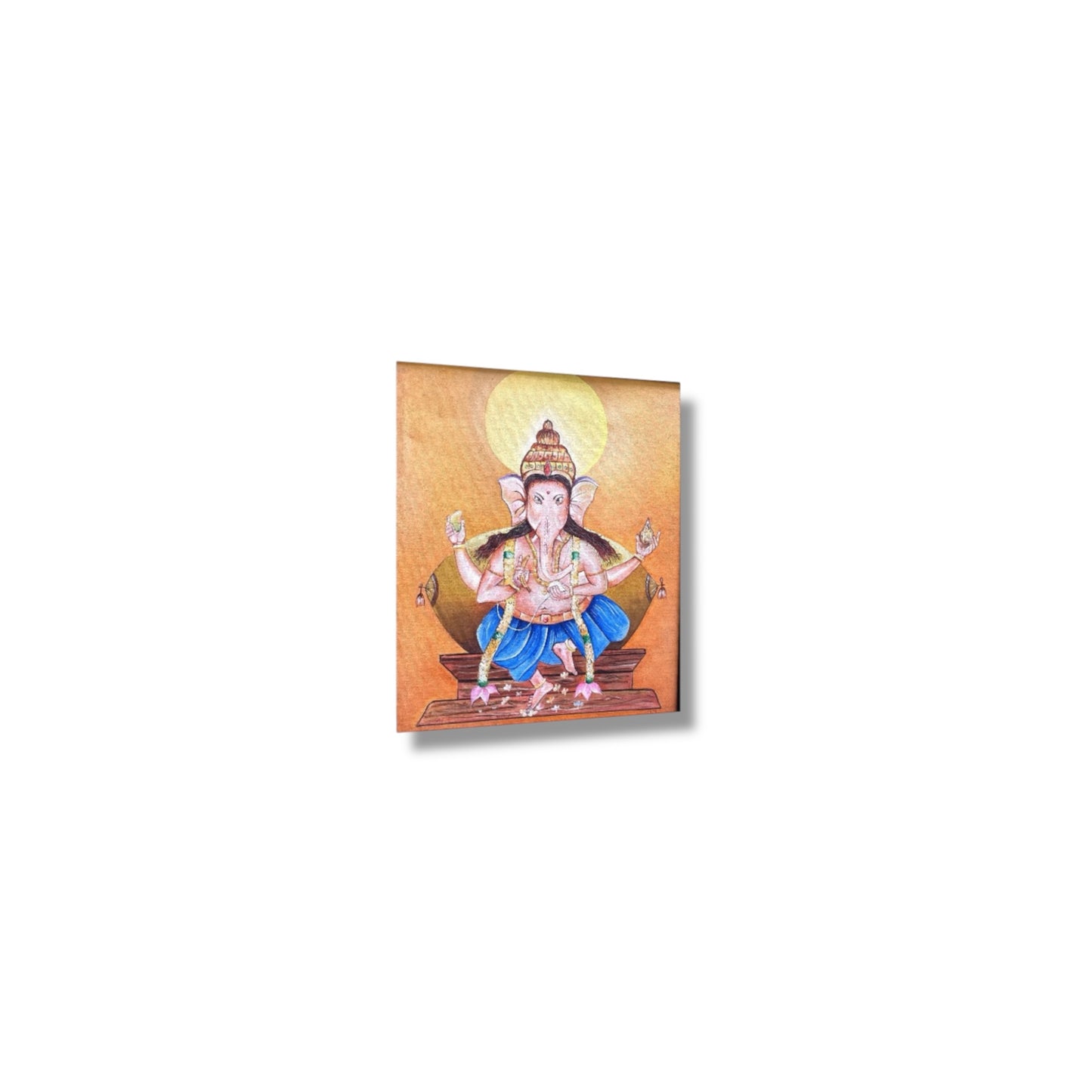This divine painting of Lord Ganesha with his consorts depicts prosperity, wisdom, and harmony. Hand-painted with intricate details and radiant colors, the artwork reflects spiritual grace and auspicious energy. Perfect for home interiors, meditation rooms, or temple décor, this framed piece also makes a meaningful gift for loved ones seeking blessings.