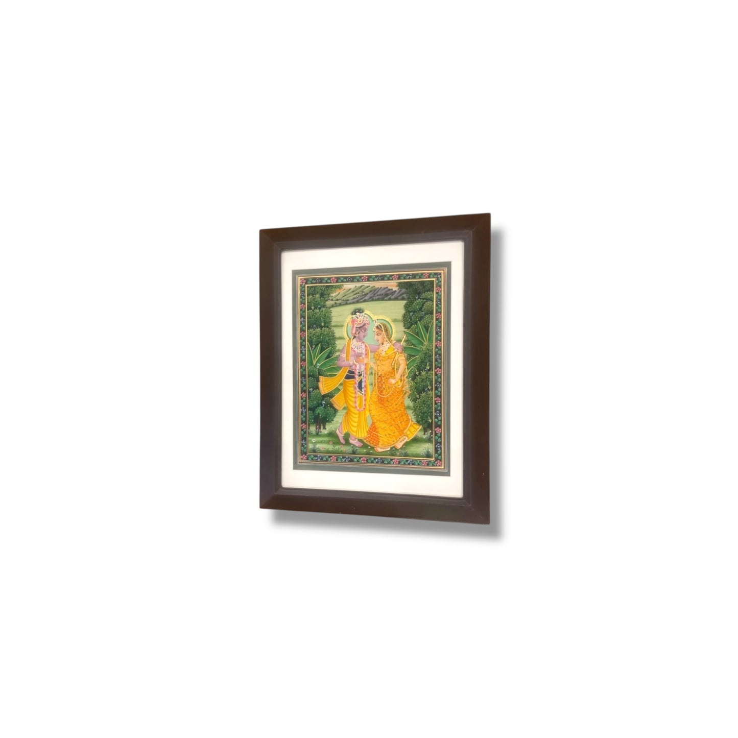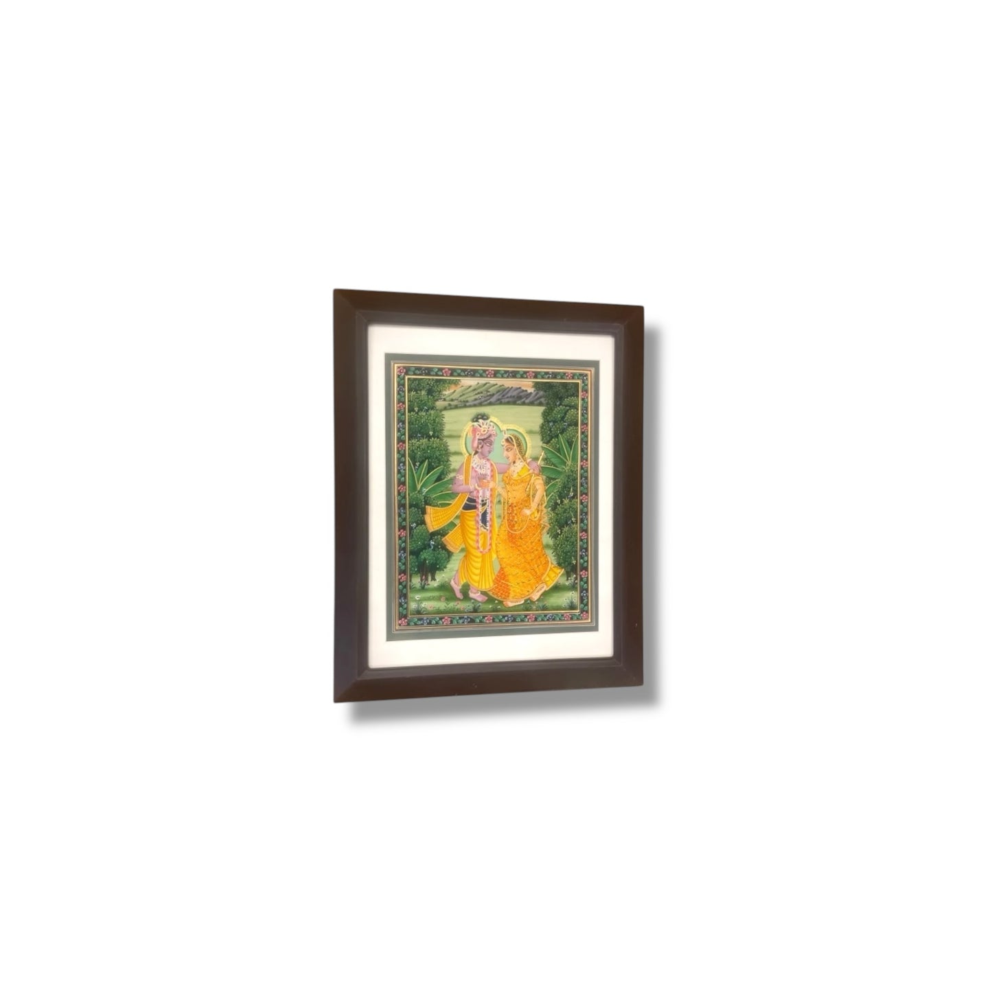 This exquisite Pichwai painting depicts Radha and Krishna in a serene garden setting, adorned in radiant yellow attire. Handcrafted in the traditional Rajasthani style, the artwork reflects devotion, love, and divine grace through intricate detailing and rich natural colors. Perfect for pooja rooms, living spaces, or art collectors, this Pichwai brings spiritual energy and timeless Indian artistry into your home décor.