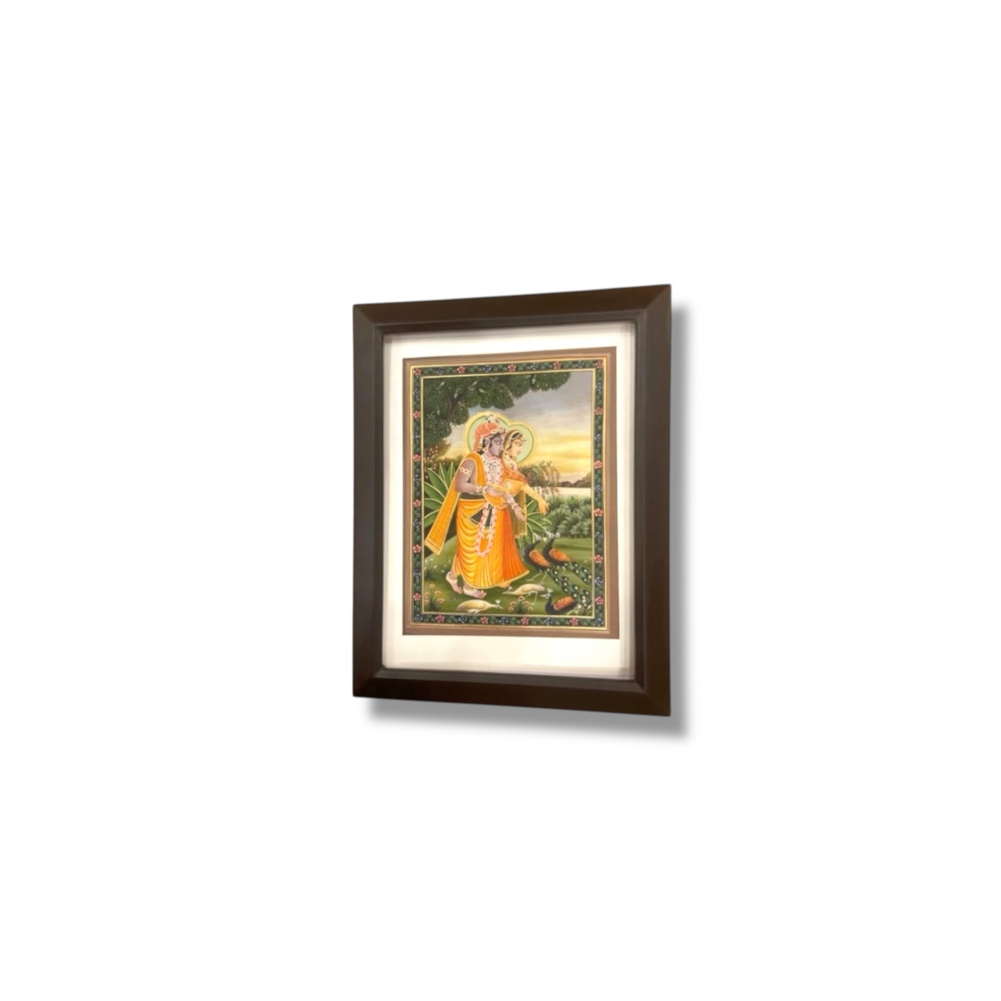 This traditional Pichwai painting depicts Radha and Krishna in a serene moment surrounded by lush greenery and graceful peacocks. Meticulously hand-painted in the Nathdwara style, the artwork reflects divine love and devotion through intricate details, vibrant colors, and delicate brushwork. Ideal for pooja rooms, living spaces, or gifting, this Pichwai painting brings home the essence of Indian heritage and timeless artistry.