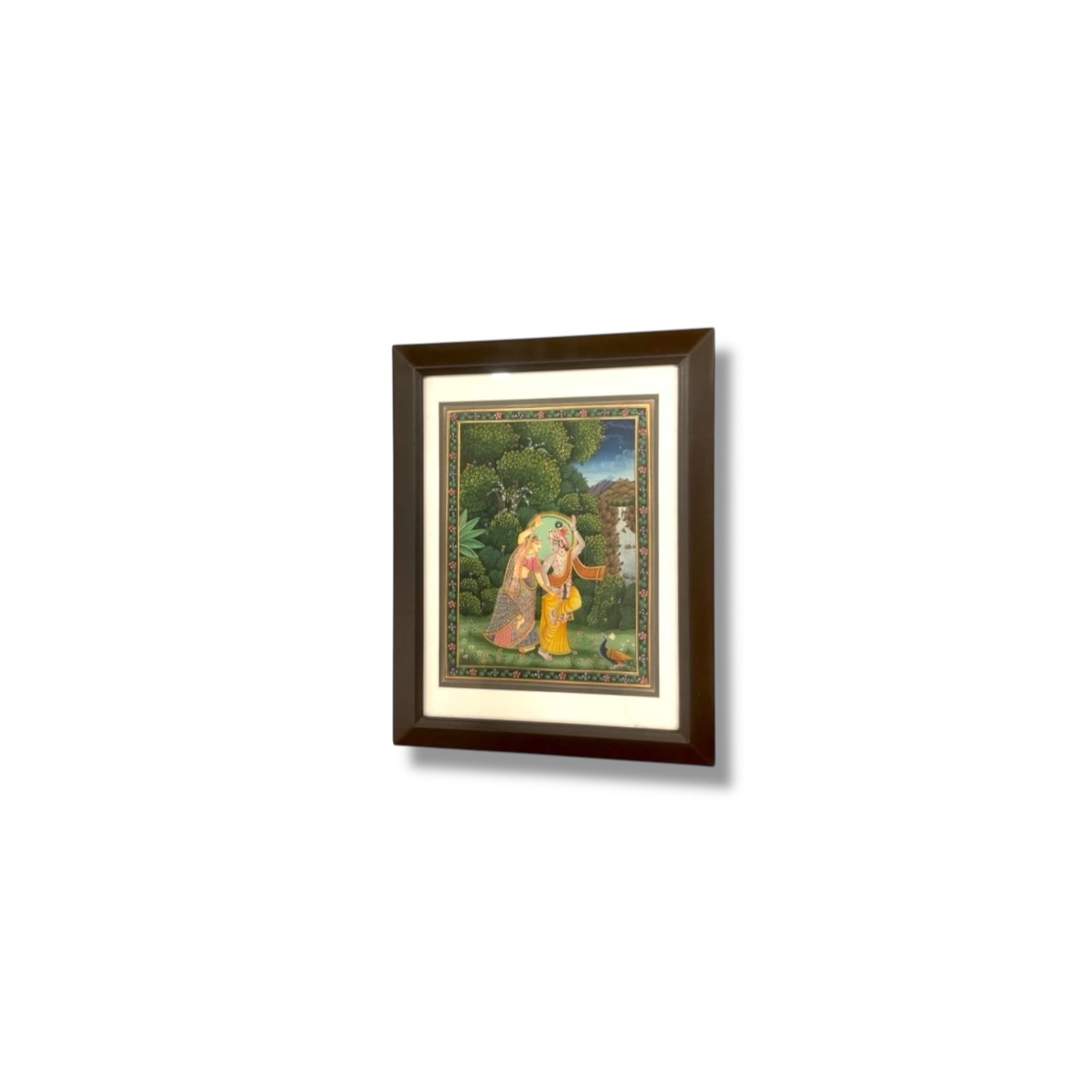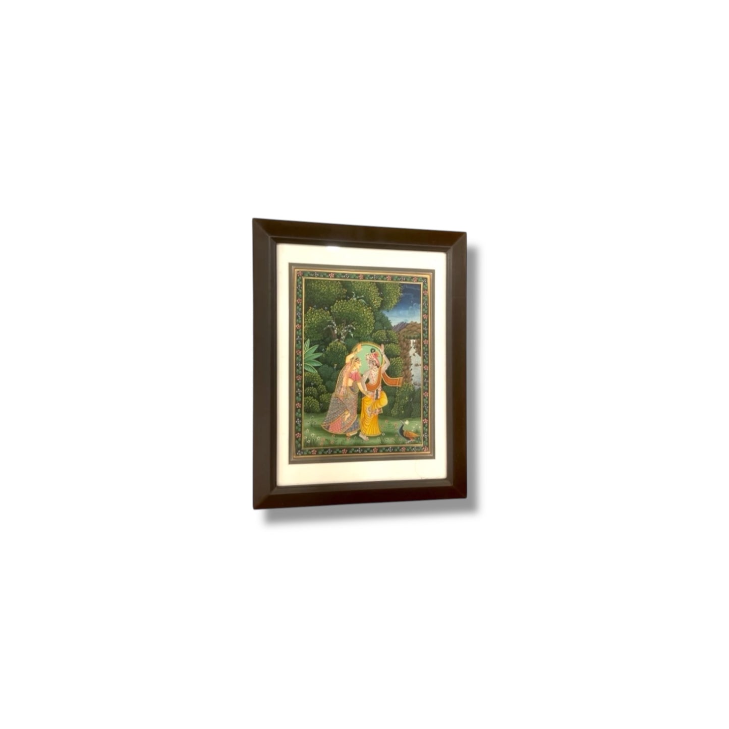 This beautiful Pichwai painting portrays Radha and Krishna beneath the sacred Kadamba tree, symbolizing divine love and eternal devotion. Hand-painted by skilled Rajasthani artisans in the traditional Nathdwara style, it features intricate floral borders, delicate brushwork, and rich natural hues. Perfect for pooja rooms, art walls, or gifting, this Pichwai painting brings peace, romance, and spiritual grace to any living space.