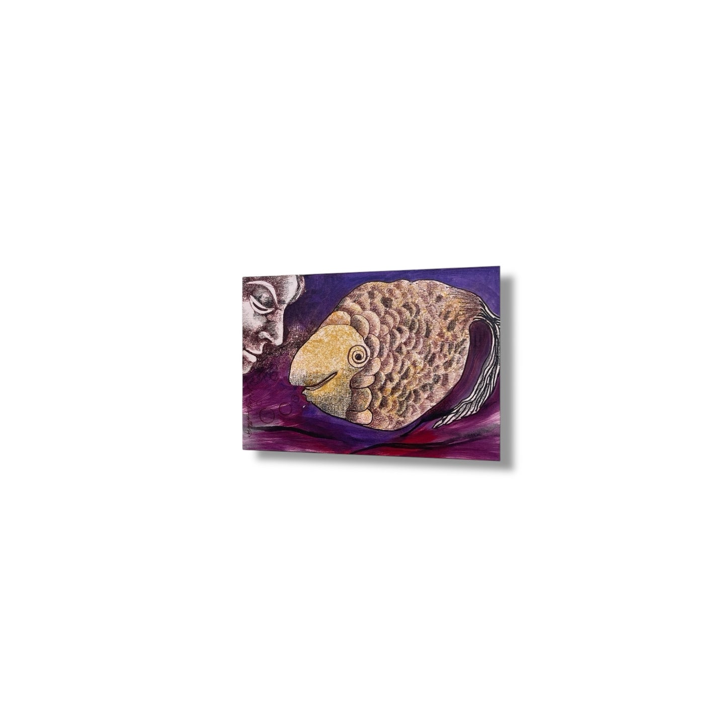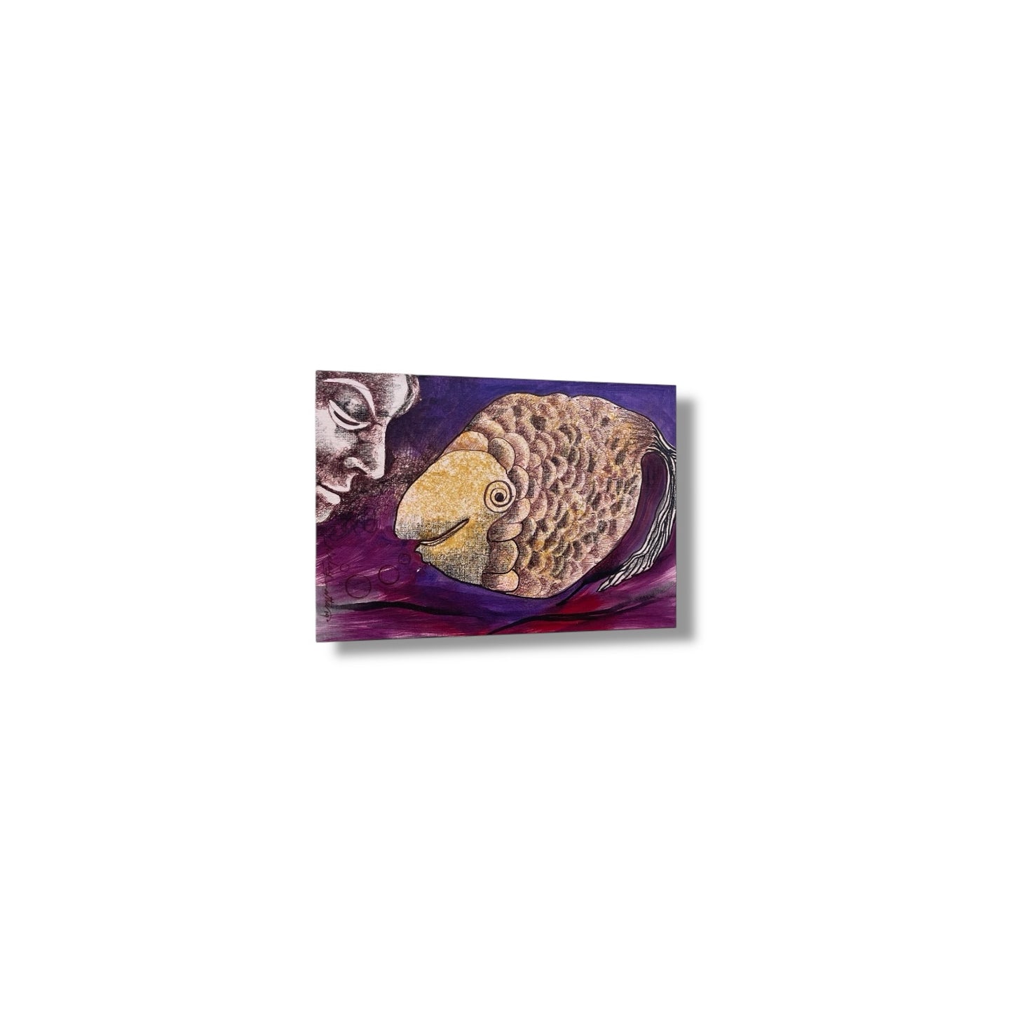 This surrealism painting portrays a captivating dialogue between a human face and a golden fish, set against a deep purple background. The artwork blends reality and imagination, symbolizing the mysterious connection between man and nature. The dreamlike composition, rich colors, and surrealist details evoke curiosity and invite introspection, making it a striking contemporary piece. Perfect for modern art collectors and interiors, this surreal artwork adds depth, symbolism, and conversation to any space.