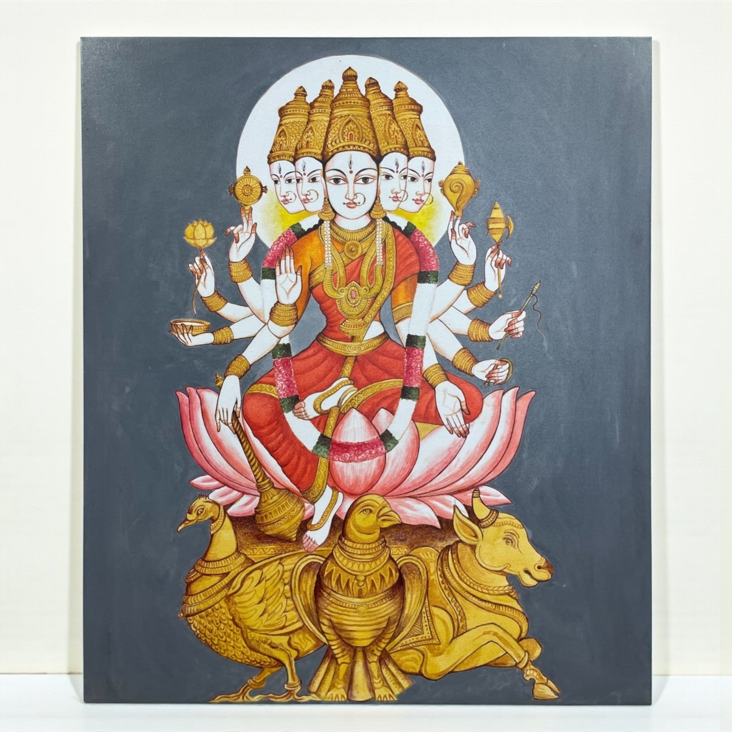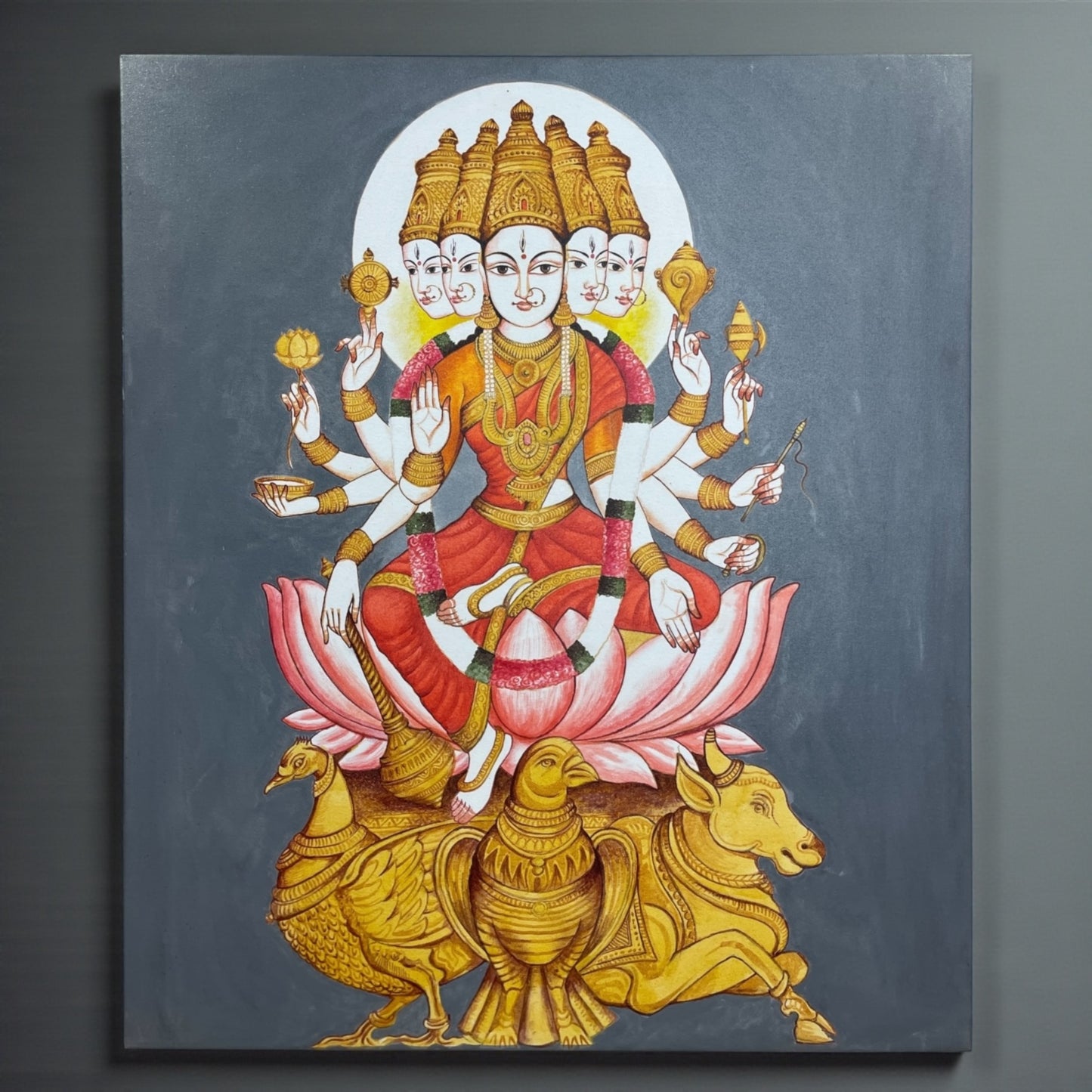 This artwork features intricate detailing, rich traditional colours, and sacred symbolism. The cow, swan, and other sacred elements beneath the lotus represent purity, knowledge, and abundance—making this painting a powerful spiritual addition to any home.